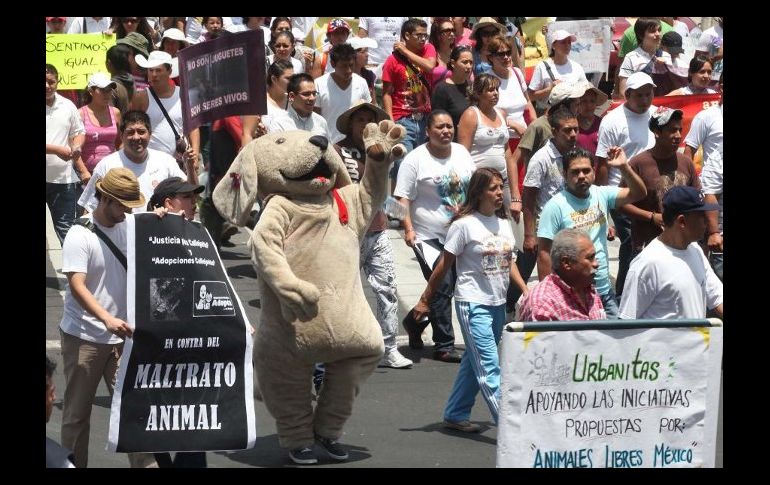 CIUDAD DE MÉXICO (17JUL/2010).- 'Dori' y 'Jack' fueron perros callejeros con suerte, pues a ambos el destino hizo que pasaran de vivir en una caja abandonada en avenida Reforma a una casa con una familia como la de Carolina Navarro, quien los adoptó. Pero 'Nicha' no tuvo la misma fortuna, a ella Sofía Monterrosa la encontró horas después de haber sido brutalmente golpeada con palos y abandonada en una banqueta; ya había muerto. A Claudia Hernández y sus hijas Carolina y Patricia defender a 'Galleta', 'Chispita' y 'Rex', tres perros callejeros, las llevó a ser amenazadas de muerte y mudarse de casa. Es por eso que hoy Sofía, Carolina, Claudia, sus hijas y cinco mil capitalinos más marcharon en el centro, desde el Ángel de la Independencia hasta el Zócalo, en defensa y para exigir el respeto de los derechos de los animales. Algunos alistaron a sus gatos, cotorros, hurones, hámsters y en su mayoría perros, ya sea de raza o criollos, e incluso de peluche, para que desfilaran por las avenidas Reforma, Juárez y Madero hasta la Plaza de la Constitución. Con pancartas, cartelones y mantas con las leyendas 'íBasta! No más corridas de toros', 'No más zoológicos, cárceles de animales' o 'Alto al maltrato de tu mejor amigo', dueños y sus mascotas pidieron reformas legales que incluyan en el Código Penal de la ciudad castigo a quienes maltraten a los animales. Marina Mercado Ríos, vocera de Asociaciones Protectoras de Animales de México (APASDEM), exigió que se ponga alto al maltrato y crueldad hacia los animales, con normas más estrictas que incluyan sanciones penales a quienes lo hagan en la ciudad. “Estamos hablando por los animales de circos, zoológicos, rastros, antirrábicos, centros de experimentación, o de los que usan en peleas, vendidos en mercados, fauna silvestre en extinción”, dijo la defensora. Detalló que con el movimiento se pretende hacer presión para que se legisle al respecto, y adelantó que la organización a su cargo ya dialoga con la Secretaría de Educación Pública (SEP) para que se incluya en los libros y programas de educación básica la cultura del respeto a los animales. En la marcha también participaron diputados locales, como Norberto Solís, del Partido Verde Ecologista de México (PVEM), quien lamentó que este sea uno de los principales países que incurra en el maltrato y destacó la importancia de erradicarlo con educación a los niños. Por su parte Cristian Vargas, legislador del Partido Revolucionario Institucional (PRI), adelantó que en septiembre su bancada promoverá en el periodo ordinario de sesiones de la Asamblea Legislativa reformas que establezcan la abolición de las corridas de toros en la ciudad. “No vamos a permitir la muerte de un toro más”, dijo tras exhortar al jefe de Gobierno, Marcelo Ebrard, a que apoye el movimiento en defensa de los derechos de los animales. Durante la manifestación no faletaron las botargas alusivas a perros, gatos y toros, las cuales con carteles pedían detener la tauromaquia, peleas de perros y gallos, así como el maltrato que sufren los animales en circos y laboratorios. A su vez Gabriela Itaja denunció el maltrato al que son sometidos los gatos en los antirrábicos, al ser matados con descargas eléctricas o ahogados. Reconoció que la falta de recursos y de una política de esterilización clara en la materia ha llevado a una proliferación de animales callejeros, proclives a ser maltratados, abusados, vejados y dañados. La marcha se llevó a cabo en el marco del Día de los Derechos de los Animales, instaurado el último domingo de junio de cada año en la capital del país.