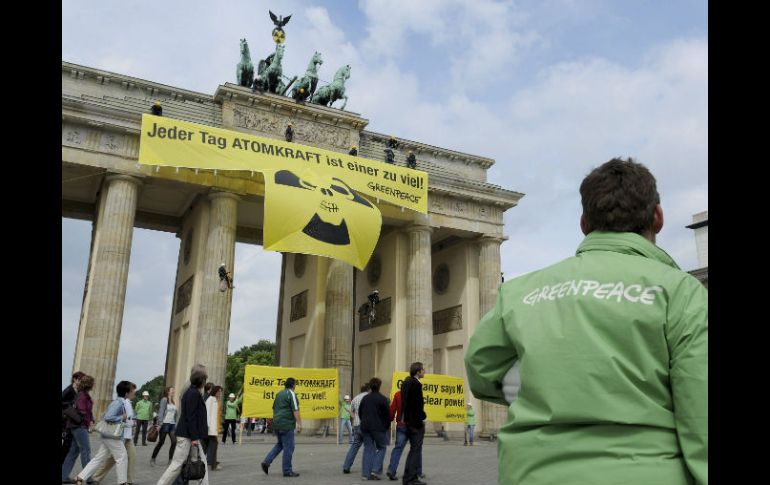 México | Activistas de Greenpeace exigen apagón nuclear inmediato al Gobierno alemán Exigen el cierre de plantas nucleares Activistas de Greenpeace exigen apagón nuclear inmediato al Gobierno alemán Por: EFE 30 de mayo de 2011 - 04:09 hs Los ecologistas desplegaron una pancarta en la icónica Puerta de Brandeburgo de Berlín. EFE / BERLÍN, ALEMANIA (30/MAY/2011).- Activistas de la organización ecologista Greenpeace colgaron una pancarta en la icónica Puerta de Brandeburgo de Berlín en la que exigen un “apagón nuclear” inmediato al Gobierno alemán. Los ecologistas desplegaron una pancarta que rezaba: “Cada día con energía nuclear es demasiado”. El grupo ecologista calificó de “totalmente inaceptable” la fecha de 2021 para desconectar definitivamente las 17 centrales nucleares del país. Miembros de la misma organización impidieron en la costa de Groenlandia que la empresa escocesa Cairn comience la perforación a gran profundidad en aguas del Ártico. Greenpeace critica a Cairn por no adoptar las medidas de precaución necesarias para evitar accidentes como el ocurrido en el derrame petrolero de British Petroleum en el Golfo de México en el 2010. Temas Europa Alemania Greenpeace Manifestaciones en el mundo Recibe las últimas noticias en tu e-mail Todo lo que necesitas saber para comenzar tu día Registrarse implica aceptar los Términos y Condiciones