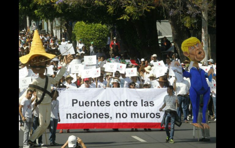 GUADALAJARA, JALISCO (13/FEB/2017).- La actual crisis diplomática, migratoria y comercial con Estados Unidos movilizó ayer a miles de mexicanos. Las manifestaciones más nutridas fueron en la Ciudad de México (20 mil personas) y en Guadalajara (15 mil). Las protestas, originalmente contra el presidente Donald Trump, sirvieron también para criticar la “débil” reacción de Enrique Peña Nieto, a quien le exigieron acciones para que se respete al país.La protesta en la Ciudad de México dio inicio en el Auditorio Nacional y cerró en el Ángel de Independencia, con una inmensa pancarta con la leyenda “A México se le respeta, Mr. Trump” y cientos de banderas ondeando. La movilización tapatía arrancó en La Minerva y concluyó en la Plaza de Armas.En la capital, Enrique Graue, rector de la UNAM, se sumó al contingente junto con otros académicos y alumnos. Pidió al Gobierno federal mandar un mensaje de soberanía y fortaleza a Estados Unidos y dejar de ver al pasado para centrar sus esfuerzos en el futuro. Por su parte, el rector de la UdeG, Tonatiuh Bravo Padilla, reprobó la actitud “xenófoba, excluyente y racista” de Trump y ofreció apoyo a estudiantes deportados.Ambas marchas fueron acompañadas con pancartas, camisetas y caricaturas del presidente republicano. “Sorry México”, escribió en una cartulina Erick Smith, un estadounidense casado con una mexicana. “No quiero ese muro. Cada vez que vengo a México me siento en casa. Vine a decir que me avergüenza mi presidente. Vine a decir ‘lo siento’ a México”.El rechazo a las nuevas políticas de Trump también reunió a intelectuales, artistas y hasta “youtubers”. Enrique y León Krauze, Héctor Aguilar Camín, Denise Dresser y Ángeles Mastretta, entre otros, se sumaron a la marcha que partió del Auditorio Nacional en la Ciudad de México.Al cierre de las manifestaciones, tanto en Guadalajara como en la capital se entonó el Himno Nacional. En la Ciudad de México los asistentes derribaron un “muro” de ladrillos blancos.La presidenta de Mexicanos Contra la Corrupción y la Impunidad, María Amparo Casar, reconoció que si bien las movilizaciones no cambiarán la política exterior, es importante crear este ambiente en favor del “respeto a México”.El impacto de las protestas fue menor en otros Estados.