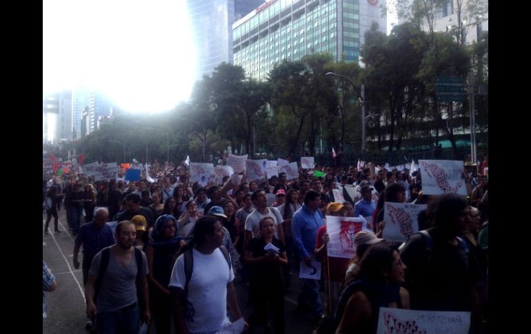 México | Siete mil personas caminan por el Paseo de la Reforma en demanda de los desaparecidos Familiares de normalistas marchan al Zócalo Siete mil personas caminan por el Paseo de la Reforma en demanda de los desaparecidos Por: SUN 8 de octubre de 2014 - 16:51 hs Organizaciones sociales y estudiantes de universidades también se unen a la causa. SUN / T. Álvarez CIUDAD DE MÉXICO (08/OCT/2014).- Familiares de los normalistas desaparecidos en Ayotzinapa, Guerrero, marchan la tarde de este miércoles de la glorieta de la columna del Ángel de la Independencia hacia el Zócalo en demanda de que presenten vivos a los jóvenes estudiantes. En un primer avance, el contingente llegó a la glorieta de La Palma mientras terminaba de acomodarse para continuar su camino hacia la Plaza de la Constitución. El Centro de Atención a Emergencias y Protección Ciudadana de la Ciudad de México indicó que aproximadamente son siete mil personas las que marchan por Paseo de la Reforma. Después de los padres y familiares de los estudiantes, caminan normalistas de otras escuelas del país seguidos por la Coordinadora Nacional de Trabajadores de la Educación (CNTE) y de otras organizaciones sociales y estudiantes de universidades como de la Universidad Nacional Autónoma Metropolitana (UAM), Universidad Nacional Autónoma de México ( UNAM) y Universidad Autónoma de la Ciudad de México (UACM). Temas Estados Distrito Federal Guerrero Manifestaciones en la Cd. de México Recibe las últimas noticias en tu e-mail Todo lo que necesitas saber para comenzar tu día Registrarse implica aceptar los Términos y Condiciones