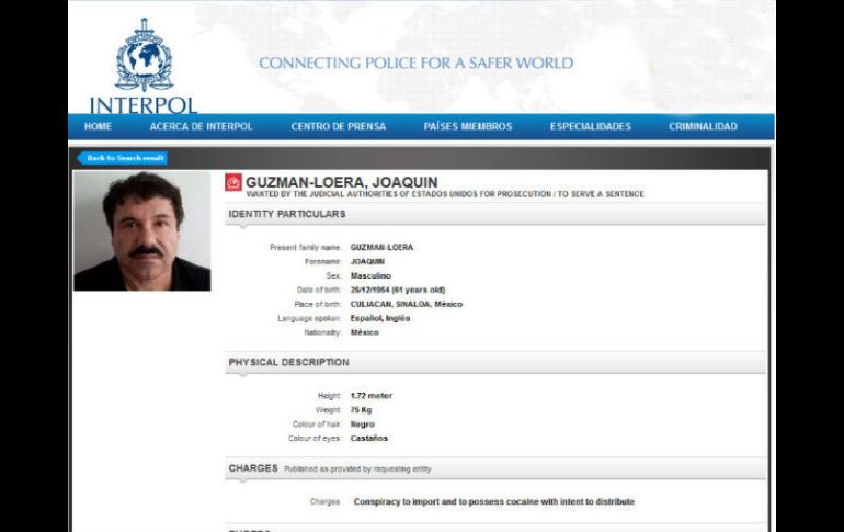 México | La Policía Internacional mantiene al líder del Cártel de Sinaloa en su lista de los más Ficha roja del 'Chapo' todavía está en página de la Interpol La Policía Internacional mantiene al líder del Cártel de Sinaloa en su lista de los más buscados Por: SUN 9 de enero de 2016 - 16:02 hs Según los datos de la organización, el capo habla inglés y español, mide 1.72 metros, pesa 75 kilos y tiene cabello castaño. ESPECIAL / www.interpol.int CIUDAD DE MÉXICO (09/ENE/2016).- La "ficha roja" de Joaquín "El Chapo" Guzmán, quien fue recapturado el viernes por fuerzas federales en Los Mochis, Sinaloa, permanece en la página web de Interpol. La Policía Internacional mantiene al líder del cártel de Sinaloa en su lista de los más buscados, pese a la reaprehensión. Según los datos que ofrece Interpol, el capo habla inglés y español, mide 1.72 metros, pesa 75 kilos, tiene pelo negro y cabello castaño. Temas Crimen Organizado Joaquín Chapo Guzmán Interpol Lee También Asesinan a Bernardo Bravo Manríquez, líder de productores de limón Asaltan a alcalde electo de Veracruz; le quitan camioneta, pero sale ileso Por segundo día, incendian vehículos en Teocaltiche Decomisan coches con reporte de robo y armas en Teocaltiche Recibe las últimas noticias en tu e-mail Todo lo que necesitas saber para comenzar tu día Registrarse implica aceptar los Términos y Condiciones