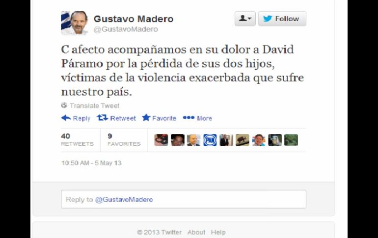 México | El presidente nacional del PAN y originario de Chihuahua, expresó su pesar Gustavo Madero lamenta muerte de hijos de periodistas Dos jóvenes asesinados el sábado por la madrugada son hijos de dos conocidos periodistas confirma la Fiscalía de Chihuahua Por: SUN 5 de mayo de 2013 - 13:49 hs El senador panista Roberto Gil también expresó sus condolencias a los comunicadores. ESPECIAL / CIUDAD DE MÉXICO (05/MAY/2013).- Gustavo Madero, presidente nacional del PAN y originario de Chihuahua, expresó su pesar por el asesinato de los hijos de los periodistas David Páramo y la editora del periódico "El Peso", edición de corte policiaco filial de El Diario de Chihuahua", Martha González Nicholson. "@GustavoMadero: Con afecto acompañamos en su dolor a David Páramo por la pérdida de sus dos hijos, víctimas de la violencia exacerbada que sufre nuestro país", redactó el panista en su cuenta de Twitter. Dos jóvenes asesinados el sábado por la madrugada son hijos de dos conocidos periodistas confirmó la Fiscalía de Chihuahua, sin embargo, hasta el momento las indagatorias apuntan a que el hecho no tiene que ver con el oficio de los padres de las víctimas, precisó la corporación. Asimismo, el senador panista Roberto Gil expresó sus condolencias a los comunicadores, "@rgilzuarth: Nuestra solidaridad a @dparamooficial. Que encuentren pronto consuelo y justicia", escribió en su cuenta de Twitter. Temas PAN Política Chihuahua Gustavo Madero Agresiones a periodistas Lee También Las tribus de la oposición y perder como método La aparente estabilidad mexicana La embriaguez del poder: cuando el alma se emborracha de sí misma Ni tan buenos ni tan malos Recibe las últimas noticias en tu e-mail Todo lo que necesitas saber para comenzar tu día Registrarse implica aceptar los Términos y Condiciones