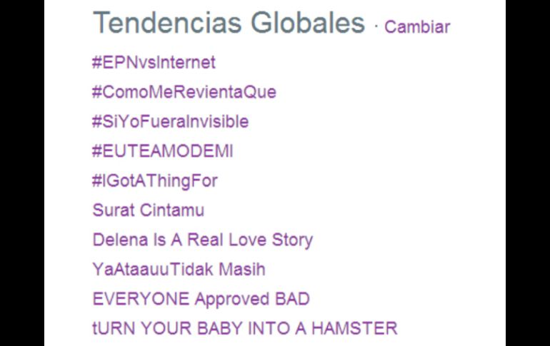 México | Fue después del mediodía cuando se pudo observar cómo repuntaba la conversación Hashtag #EPNvsInternet se vuelve tendencia mundial en Twitter Fue después del mediodía cuando se pudo observar cómo repuntaba la conversación con ese identificador Por: EL INFORMADOR 21 de abril de 2014 - 17:05 hs GUADALAJARA, JALISCO (21/ABR/2014).- Pese a que no es el primer "hashtag" surgido en México que se coloca como "trending topic" mundial, hoy la etiqueta #EPNvsInternet se enlista entre los temas populares de Twitter a nivel mundial. Fue después del mediodía cuando se pudo observar cómo repuntaba la conversación con ese identificador y se incluía en la lista de "tendencias" de la red social. Con #EPNvsInternet, activistas y usuarios en general comentan sobre los riesgos de la propuesta de reforma a las leyes secundarias en materia en telecomunicaciones y radiodifusión que envió el Ejecutivo al Senado. Quienes critican la iniciativa aseguran que hay al menos cinco artículos que, si se aplican las modificaciones, pueden dañar las libertades de los usuarios de Internet. Otro de los conceptos que aparecen ocasionalmente entre los temas más populares a nivel mundial es "What's Happening in Mexico" (¿Qué está pasando en México?). Otros "hashtags" de México para el mundo El 22 de febrero pasado, la noticia de la reaprehensión de Joaquín "El Chapo" Guzmán también ocupó un lugar relevante entre las conversaciones de Twitter en todo el mundo con el "hashtag" #ChapoGuzmán. En septiembre de 2013, antes de la ceremonia del Grito de Independencia, ante el desalojo de maestros del CNTE del Zócalo de la Ciudad de México, el "hashtag" #CNTEseQueda también se posicionó entre los más populares de la red a escala mundial. En mayo de 2012, con el debate entre candidatos presidenciales, hubo diversas etiquetas que ocuparon sólo por minutos una posición en la tabla de temas populares: #MéxicoVaAGanarConEPN, #peñapierdeporque y Debate2012. De las redes a la calle Los grupos de activistas convocan a llevar la protesta a las calles de manera pacífica. De ahí que invitan a quienes quieran sumarse a manifestaciones este 22 de abril a partir de las 18:00 horas en ciudades como Guadalajara, Ciudad de México y Monterrey. En Guadalajara, el movimiento es convocado por miembros del colectivo #YoSoy132, #Másde131 y con el respaldo de la Asociación Mexicana de Derecho a la Información (Amedi) y partirá de avenida Chapultepec, en su cruce con Avenida Vallarta. ¿Qué es un 'trending topic' y cómo funciona? Desde que Twitter comenzó a funcionar en 2008, sus creadores han sido cuestionados sobre el funcionamiento de los llamados "trending" o temas del momento en la red social, a esto responden que las tendencias son generadas automáticamente por un "algoritmo" que identifica los temas de lo que más se habla en el momento. La lista de "trending topic" está diseñada para ayudar a las personas a descubrir "noticias de todo el mundo, en tiempo real". Si alguien quisiera posicionar una etiqueta entre los temas populares de la red, podría recurrir a pagar una campaña de difusión en Twitter, pero la compañía no revela el costo de esta estrategia y según avisa en su página para negocios, esta opción aún no está disponible en México ni Latinoamérica. La opción más viable hasta ahora es lograr que muchas personas publiquen mensajes en la red con el hashtag deseado. Para esto es clave hacer que participen los usuarios con más seguidores (personalidades, famosos o "tuitstars"), de tal manera el mensaje podría difundirse con más viralidad. Temas Gobierno de México Enrique Peña Nieto Telecomunicaciones Twitter Redes Sociales Lee También CURP biométrica : ¿Dónde sacar cita para el trámite en CDMX? Detienen a Lex Ashton 'N' por homicidio y tentativa de homicidio Fallece influencer Fede Dorcaz en presunto intento de robo en la CDMX Bad Bunny permanece sentado durante "God Bless America" y enciende las redes Recibe las últimas noticias en tu e-mail Todo lo que necesitas saber para comenzar tu día Registrarse implica aceptar los Términos y Condiciones