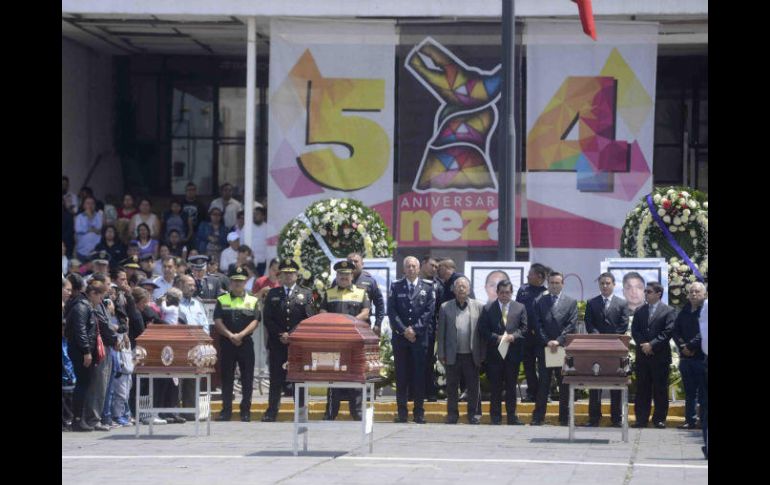 CIUDAD DE MÉXICO (06/MAY/2017).- Vecinos, policías y autoridades de Nezahualcóyotl rindieron un homenaje a los tres policías municipales que fueron asesinados al tratar de impedir un asalto en unas oficinas del PRI.Ayer viernes, un grupo armado ingresó a la sede del Comité de Gestión Social A. C., en la colonia La Perla, presuntamente con la intención de asaltar a las personas que se encontraban en el interior. Oficiales que se encontraban cerca del lugar intervinieron y se inició una balacera.A causa del enfrentamiento murieron tres policías municipales, un hombre que se encontraba en las oficinas y uno de los presuntos ladrones.Los féretros de los oficiales Onésimo Mendoza Romero, Luz María Aldas Castro y Aldo Alejandro Flores Torres se colocaron en la explanada del municipio junto con arreglos florales.El presidente municipal Juan Hugo de la Rosa participó la ceremonia en la que el helicóptero Coyote sobrevoló y dejó caer pétalos de rosas.