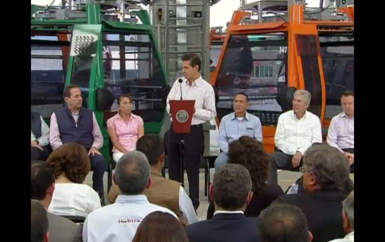 ECATEPEC, EDOMEX. (04/OCT/2016).- El Presidente Enrique Peña Nieto inauguró en este municipio mexiquense el “Mexicable”, sistema de transporte público teleférico. El mandatario hizo su arribo a bordo de una de las góndolas panorámicas.En compañía del gobernador del Estado de México, Eruviel Ávila, el jefe del Ejecutivo Federal, destacó que este sistema de transporte público, único en su tipo, cambiará la calidad de vida en la zona de La Cañada en Ecatepec.Se logró, dijo, gracias a la coordinación de trabajo entre el gobierno federal, estatal, municipal y la Iniciativa Privada.El “Mexicable” es el primer teleférico que se utilizará como transporte público para movilizar a los habitantes de San Andrés de La Cañada en Ecatepec.Se trata de 4.8 kilómetros que se recorrerán a lo largo de siete estaciones.El costo del transporte será de seis pesos.El Presidente Peña Nieto destacó que con el “Mexicable” se desarrolló una obra cultural en la zona, denominada Proyecto La Calle es Tuya.La obra, añadió, se enmarca en el proyecto de infraestructura urbana, vial y carretera, entre otras, que el gobierno federal impulsa.A su llegada a la zona, el Presidente Peña Nieto fue recibido por colonos que solicitaron el servicio de agua.A ello, el jefe del Ejecutivo Federal se comprometió que a través de la Comisión Nacional del Agua (Conagua) se buscará asegurar el abasto regular del servicio.