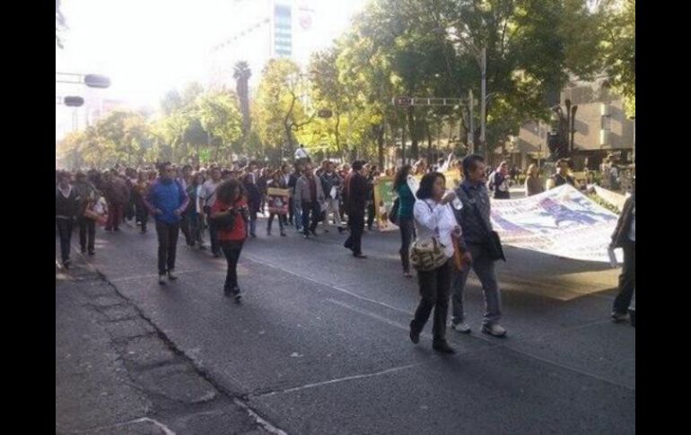 México | Marchan sobre Reforma después de pedir liberación de compañero La CNTE regresa a 'plantón' tras protesta en PGR Marchan sobre Reforma después de pedir liberación de compañero Por: SUN 21 de enero de 2014 - 13:34 hs 'Integrantes de la #CNTE protestan frente a las oficinas de la PGR' @smirmidones. Foto: Twitter ESPECIAL / CIUDAD DE MÉXICO (21/ENE/2014).- Luego de protestar frente a las instalaciones de la Procuraduría General de la República (PGR), integrantes de la Coordinadora Nacional de Trabajadores de la Educación ( CNTE) marchan sobre paseo de la Reforma, para regresar a su campamento. Debido al paso de manifestantes ambos carriles de avenida de los Insurgentes fueron cerrados por los inconformes. Al lugar arribaron granaderos para encausar la caminata. Al menos 100 maestros permanecieron frente a las instalaciones de la dependencia federal, en el cruce con Río Neva, sobre los carriles laterales en dirección al Poniente, donde fueron resguardados por elementos de la Secretaría de Seguridad Pública del Distrito Federal ( SSP-DF). Ahí pidieron la liberación de cuatro de sus compañeros detenidos por secuestro desde el año pasado. Los integrantes del magisterio se trasladaron en operación hormiga desde su campamento, situado en el Monumento a la Revolución. Temas PGR SSPDF Estados CNTE Manifestaciones en la Cd. de México Recibe las últimas noticias en tu e-mail Todo lo que necesitas saber para comenzar tu día Registrarse implica aceptar los Términos y Condiciones