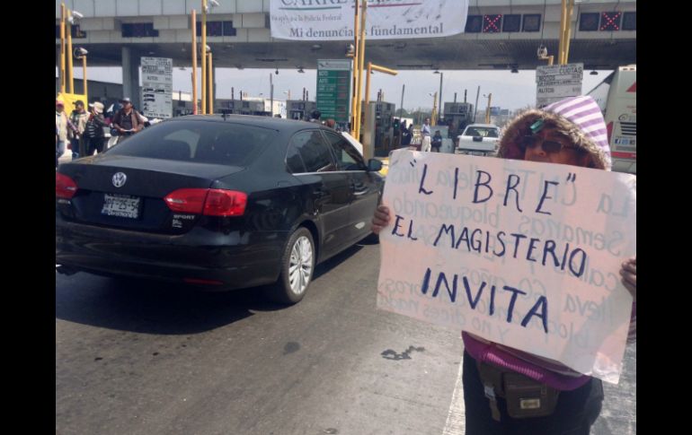México | Se colocan en las banquetas de la caseta La Venta en oposición de la Ley Educativa La CNTE toma autopista México-Toluca por seis horas Se colocan en las banquetas de la caseta La Venta en oposición de las reformas a la Ley Educativa Por: SUN 16 de octubre de 2013 - 18:25 hs Los maestros levantan plumas y evitan que los automovilistas pagaran su cuota en la caseta conocida como La Venta. SUN / CIUDAD DE MÉXICO (16/OCT/2013).- Tras seis horas de permitir el libre paso de autos en la autopista México-Toluca, los integrantes de la sección 18 de la Coordinadora Nacional de Trabajadores de la Educación ( CNTE) se retiraron de su manifestación pacífica. Ellos se oponían a las reformas a la Ley Educativa por lo que se aportaron en las banquetas de la caseta de cobro conocida como La Venta, levantaron plumas y evitaron que los automovilistas pagaran su cuota. Los profesores llegaron en "operación hormiga" desde las 10 de la mañana de este miércoles y minutos antes de las 16:00 horas comenzaron a regresar al Monumento a la Revolución. Temas Estados Ciudad de México CNTE Manifestaciones en la Cd. de México Lee También Esta es la ubicación de las presas que abastecen al Sistema Cutzamala Reportan dos muertos por lluvias en México México reacciona a acuerdo de paz entre Israel y Hamás ¿Dónde ver EN VIVO el partido amistoso México vs Colombia? Recibe las últimas noticias en tu e-mail Todo lo que necesitas saber para comenzar tu día Registrarse implica aceptar los Términos y Condiciones