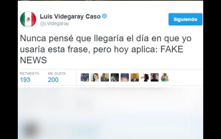 GUADALAJARA, JALISCO (09/FEB/2017).- La Secretaría de Relaciones Exteriores desmintió esta noche la versión de que el canciller Luis Videgaray Caso haya hecho cambios a un discurso del presidente estadounidense Donald Trump.En posicionamientos presentados a medios de comunicación, la Cancillería negó la versión presentada por CBS News, según la cual el canciller pudo "suavizar" el discurso de Trump del pasado 25 de enero, cuando anunció la construcción del muro fronterizo entre ambos países.Por su parte, el canciller utilizó su cuenta oficial de Twitter @LVIdegaray para emitir un mensaje, tanto en inglés como en español, en el que aludió a un frecuente comentario de Trump cuando se enfrenta a la prensa: "Nunca pensé que llegaría el día en que yo usaría esa frase, pero hoy aplica: FAKE NEWS (noticias falsas)".