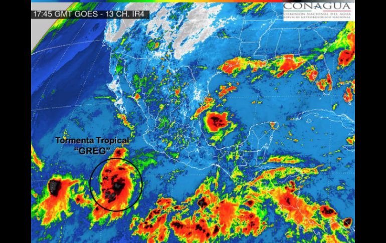CIUDAD DE MÉXICO (19/JUL/2017).- El Servicio Meteorológico Nacional (SMN) reportó que la tormenta tropical 'Greg' se localiza al suroeste de Colima con desplazamiento hacia el oeste.En el aviso más reciente emitido por el organismo dependiente de la Comisión Nacional del Agua (Conagua) informó que 'Greg' se ubica a 765 kilómetros al suroeste de Playa Perula, Jalisco, y a 785 kilómetros al suroeste de Manzanillo, Colima.Indicó que el fenómeno natural registra vientos sostenidos de 85 kilómetros por hora y rachas de 100 kilómetros por hora.El Meteorológico precisó que 'Greg' presenta desplazamiento hacia el oeste a 17 kilómetros por hora.