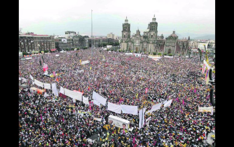 México | Cierra campaña en la Plaza de la Constitución López Obrador, arropado por un Zócalo a reventar El candidato de las izquierdas a la Presidencia cierra campaña en la Plaza de la Constitución Por: EL INFORMADOR 28 de junio de 2012 - 02:00 hs CIUDAD DE MÉXICO (28/JUN/2012).- El Zócalo estuvo a reventar, y no fue por la presencia del Beatle Paul McCartney o por la del juvenil Justin Bieber; no, esta vez quien lo colmó de almas fue Andrés Manuel López Obrador. En el cierre de campaña del abanderado de las izquierdas mostró el músculo del Movimiento Progresista. El “motor del cambio verdadero”, como él le llamó. “Con el pueblo todo, sin el pueblo nada”, manifestó en la Plaza de la Constitución de la capital del país. El tabasqueño agradeció el apoyo del ingeniero Cuauhtémoc Cárdenas, de los dirigentes de los partidos de la Revolución Democrática (PRD), del Trabajo (PT), y Movimiento Ciudadano (MC). “Terminamos bien esta etapa de lucha por la transformación de México, ésta fue la mejor campaña: visitamos todas las regiones del país, escuchamos sus sentimientos y dimos a conocer el proyecto alternativo de nación”, dijo ante una multitud reunida en el Zócalo. En su cierre de campaña, López Obrador aseveró que durante todos sus recorridos por el país las plazas, como hasta el día de ayer, siempre se llenaron. “Contamos con la participación de dos millones de ciudadanos que asistieron a nuestros actos, no tuvimos ningún incidente, tampoco ningún rechazo de ninguna índole, todo se desenvolvió de acuerdo a lo planeado”. FRASES"No se preocupen, no les voy a fallar, no voy a traicionar al pueblo de México. Soy muy consciente de mi responsabilidad histórica ""Así como me quieren, así los quiero yo "Andrés Manuel López Obrador, candidato a la presidencia de la República. Temas PRD Política AMLO Partido del Trabajo Elecciones México 2012 Movimiento Ciudadano Lee También Zague aseguró que "no existe calidad" en el futbol mexicano Suman 48 muertos y miles de damnificados por lluvias en cinco estados ¿Qué alimentos SÍ pueden comer las ardillas y cuáles NO? La aparente estabilidad mexicana Recibe las últimas noticias en tu e-mail Todo lo que necesitas saber para comenzar tu día Registrarse implica aceptar los Términos y Condiciones