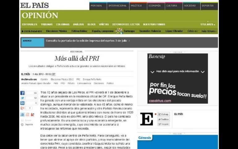 México | Peña Nieto ha ganado con una ventaja nítida en las elecciones, dice el texto López Obrador, sin razón para cuestionar resultados: El País ''Probablemente (Andrés Manuel) ya no forma parte del futuro político de este país'', afirma el artículo de opinión Por: SUN 2 de julio de 2012 - 21:11 hs El diario español ''El País'' publica el artículo de opinión titulado ''Más allá del PRI'' en su edición de internet. / CIUDAD DE MÉXICO (02/JUL/2012).- El candidato presidencial del Movimiento Progresista, Andrés Manuel López Obrador, no tiene razón para cuestionar los resultados electorales de este domingo en México, estima el diario español ''El País'' en su editorial del 3 de julio. ''Andrés Manuel López Obrador carece de toda razón para cuestionar los resultados de las presidenciales. Pese a haber sacado un resultado mejor del esperado, probablemente ya no forma parte del futuro político de este país'', afirma el artículo de opinión. La pieza titulada ''Más allá del PRI'' hace eco de los resultados preliminares de este domingo y lunes, que dan una ventaja de por lo menos seis puntos al candidato de la coalición Compromiso por México. ''Enrique Peña Nieto ha ganado con una ventaja nítida en las elecciones del pasado domingo, aunque menor de la vaticinada. A sus 45 años, como él mismo ha recordado, representa otra generación y otro Partido Revolucionario Institucional distintos al que gobernó México con mano de hierro de 1929 hasta 2000''. El diario expone que la labor central de Peña debe ser impulsar reformas para liberalizar el sector energético, abriendo Pemex a la inversión privada, reformar la educación e instaurar unos sistemas fiscal y judicial eficaces y modernos que permitan superar la enorme corrupción. El PRI logró una mayoría relativa, no absoluta, en el Congreso. ''Y el próximo Presidente debe ser consciente de que más de uno de cada dos ciudadanos que han votado no lo han hecho por él. Esta situación puede resultarle incluso útil para resistir las presiones autocráticas del viejo PRI, que aún existe'', remata. Temas Enrique Peña Nieto AMLO Elecciones México 2012 Recibe las últimas noticias en tu e-mail Todo lo que necesitas saber para comenzar tu día Registrarse implica aceptar los Términos y Condiciones