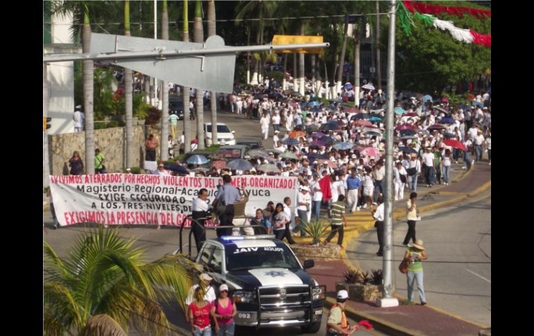 México | Piden una reunión para dialogar sobre inseguridad en las escuelas Maestros inician plantón en Acapulco Los maestros bloquearon parte de la costera Miguel Alemán, lo que generó caos vehicular de los automotores que se dirigían al centro de la ciudad Por: SUN 14 de septiembre de 2011 - 13:12 hs En demanda de mayor seguridad, maestros marcharon por la Avenida Costera Miguel Alemán. EL UNIVERSAL / ACAPULCO, GUERRERO (14/SEP/2011).- Tras concluir la marcha por la zona turística de Acapulco, maestros paristas decidieron realizar un plantón y bloqueo frente a las instalaciones del Centro de Convenciones para exigirle al gobernador de Guerrero, Ángel Aguirre, que convoque a una reunión para dialogar sobre la inseguridad en las escuelas. Los maestros bloquearon parte de la costera Miguel Alemán, lo que generó caos vehicular de los automotores que se dirigían al centro de la ciudad. Los manifestantes rechazaron el ofrecimiento del secretario de Gobierno del estado, Humberto Salgado, para tener una reunión emergente y desactivaran la propuesta, propuesta que fue rechazada. Por su parte, Salgado, aseguró que los maestros el lunes regresarían a clases y que el gobierno del estado ha mostrado toda su voluntad para brindarle la seguridad necesaria a los docentes para que regresen a las aulas. Hasta esta hora, los profesores continúan en plantón y bloqueo carretero; exigen que llegue e lgobernador para que puedan terminar la protesta. La mañana de hoy, un contingente de más de dos mil 500 maestros marcharon por la zona turística de Acapulco para exigirle a los tres niveles de gobierno que brinden las garantías de seguridad para que regresen a clases, y que dicho operativos estén encabezados por las fuerzas federales. Los maestros, que vestían de blanco, portaron manta con leyendas como: "Vivimos aterrados por hechos violentos del crimen organizado", "El magisterio regional de Acapulco y Coyuca exige paz y seguridad", "Exigimos la presencia del gobernador del estado". A 19 días de paro laboral, los maestros salieron a las calles de Acapulco para exigir también al gobernador que sostenga una reunión en la que, frente a frente, solucionen el problema de inseguridad que se vive en varias zonas del puerto. El paro de labores inició el pasado 26 de agosto, cuando una decena de maestros de la zona escolar del área suburbana de Acapulco fueron objeto de amenazas de extorsión, además de que otros fueron secuestrados y otros más víctimas de robo a mano armada y robo de vehículos. Temas SNTE Estados Guerrero Manifestaciones en México Lee También "Raymond" baja su potencia, pero tocará tierra en horas En Hidalgo, caminos destrozados complican rescates y ayuda México vs Argentina: ¿Quién ganará el partido según la IA? Así se celebrará en Guanajuato el Día de Muertos Recibe las últimas noticias en tu e-mail Todo lo que necesitas saber para comenzar tu día Registrarse implica aceptar los Términos y Condiciones
