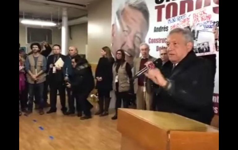 NUEVA YORK, ESTADOS UNIDOS (13/MAR/2017).- Un grupo de manifestantes obligó al líder nacional de Morena, Andrés Manuel López Obrador, a acortar un encuentro con migrantes que se realizó la tarde de este lunes en esta ciudad estadounidense.Los manifestantes subieron al estrado con pancartas criticando la relación de López Obrador con el ex alcalde de Ayotzinapa, Guerrero, José Luis Abarca, y lo acusaron de tener una “doble moral” por visitar a los migrantes solamente en época de elecciones.El evento, que tuvo lugar en el Widdi Catering Hall, había iniciado con más de una hora de retraso, y sólo duró 28 minutos.Otro evento que López Obrador tenía planeado para mañana martes en la ONU fue cancelado por la tormenta de nieve que se prevé llegue la tarde de este lunes a la ciudad.