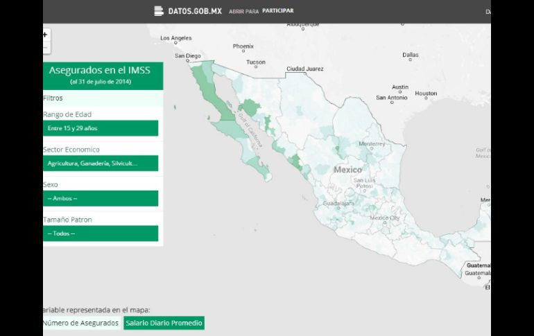México | Tijuana es la región con más jóvenes asegurados, con 138 mil 912 Mapa presenta municipios con más asegurados por IMSS Tijuana, Baja California es la región con más jóvenes asegurados, con 138 mil 912, seguido de León, Guanajuato y Zapopan, Jalisco Por: SUN 18 de enero de 2015 - 08:26 hs El mapa presenta las cifras con desgloses distintos. ESPECIAL / http://datos.gob.mx/ CIUDAD DE MÉXICO (18/ENE/2015).- A partir de información del Instituto Mexicano del Seguro Social (IMSS), el portal de datos abiertos del Gobierno Federal, www.datos.gob.mx, desarrolló un mapa interactivo que permite conocer el número de derechohabientes de servicios de salud por parte de esta dependencia que hay en cada municipio del país. A través de la herramienta Asegurados y Salarios en el IMSS se dan a conocer los datos correspondientes por rango de edad, sector económico, sexo y tamaño de patrón, es decir, la cantidad de empleados que éste tiene a su cargo. Asimismo, presenta las cifras con dos desgloses distintos, uno es por número de derechohabientes y el otro es por salario diario promedio de los trabajadores en cada localidad. Por rango de edad, destaca que los municipios con mayor número de asegurados de 15 a 29 años son Tijuana (Baja California) con 138 mil 912, León (Guanajuato) con 118 mil 477, Zapopan (Jalisco) con 106 mil 85, Querétaro (Querétaro) con 106 mil 20 y Juárez (Chihuahua) con 101 mil 513. Los mismos municipios concentran a la mayoría de asegurados entre los 30 y 49 años de edad, para este rango, Tijuana contabiliza 197 mil 302, seguido por Juárez con 170 mil 913, León con 160 mil 532, Querétaro con 147 mil 818 y Zapopan con 144 mil 970. Respecto a los asegurados mayores de 50 años de edad, León es el municipio que cuenta con más derechohabientes del IMSS al sumar 38 mil 612; mientras Tijuana alberga a 38 mil 256 personas que gozan de servicios públicos de seguridad social. Con base en el mapa, Tijuana es el municipio con más mujeres aseguradas por el IMSS, ya que en éste residen 154 mil 124 féminas con derecho a servicios de salud por parte de dicha dependencia. Asimismo, la cifra de personas de sexo femenino derechohabientes de este instituto rebasa los 80 mil casos en otras seis localidades, éstas son Mexicali (Baja California) con 80 mil 271, Chihuahua (Chihuahua) con 90 mil 554, Zapopan (Jalisco) con 106 mil concentran poblaciones grandes de asegurados de más de 50 años son Querétaro con 35 mil 178, Monterrey (Nuevo León) con 34 mil 466 y Juárez con 34 mil 97. Si quieres conocer más datos, no dudes en visitar el mapa haciendo CLIC AQUÍ. Temas IMSS Empleo Estados Lee También CDMX, con pronóstico de lluvias fuertes hoy sábado Diputada propone Home Office por lluvias en la CDMX Difícil cierre para el peso; rompe el techo de las 19 unidades por dólar Cómo controlar la colitis nerviosa, revela médico del IMSS Recibe las últimas noticias en tu e-mail Todo lo que necesitas saber para comenzar tu día Registrarse implica aceptar los Términos y Condiciones