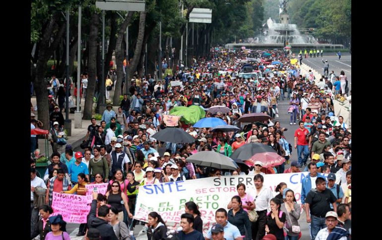 México | Alrededor de 12 mil las personas conforman la manifestación Marcha de la CNTE llega al Senado El dirigente magisterial, Rubén Núñez Ginés, reitera que se mantienen en la ''insurrección'' y la ''desobediencia civil pacífica'' Por: SUN 4 de septiembre de 2013 - 12:27 hs Maestros de la CNTE durante la marcha que partió del Auditorio Nacional hacia el Congreso de la Unión. NTX / CIUDAD DE MÉXICO (04/SEP/2013).- Al llegar el contingente de maestros al Senado de la República, después del mediodía, Rubén Núñez Ginés, secretario general de la sección 22 de la Coordinadora Nacional de Trabajadores de la Educación ( CNTE), fue el primero de los líderes que se suma al contingente. La Policía del Distrito Federal informó que son alrededor de 12 mil las personas las que se movilizaban sobre Paseo de la Reforma. Núñez Ginés dio a conocer que la mesa que mantiene el magisterio oaxaqueño con el gobierno de Gabino Cué se encontraba en una fase de receso, a pesar de que las negociaciones se realizaron hasta las 11 horas de ayer martes. Informó que no se darán detalles de las conversaciones, debido a que aún no existen coincidencia ni acuerdos finales. El dirigente magisterial reiteró que se mantienen en la "insurrección" y en la "desobediencia civil pacífica". Temas Cámara de Senadores Estados CNTE Manifestaciones en la Cd. de México Recibe las últimas noticias en tu e-mail Todo lo que necesitas saber para comenzar tu día Registrarse implica aceptar los Términos y Condiciones