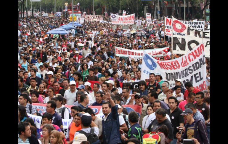 México | Profesores del SNTE se manifiestan en contra de las reformas Marchan en Acapulco contra reformas educativa y laboral Por lo menos 800 mil alumnos de educación básica se quedaron sin atención debido a la manifestación Por: NTX 18 de febrero de 2013 - 16:41 hs Imagen de una manifestación contra la reforma laboral. ARCHIVO / ACAPULCO, GUERRERO (18/FEB/2013).- Como parte de las acciones de rechazo a las reformas educativa y laboral, maestros de la sección XIV del Sindicato Nacional de Trabajadores de la Educación (SNTE) realizaron este lunes una manifestación en la Costera Miguel Alemán. En repudio a la reforma educativa, los maestros recorrieron algunas calles del puerto. Después de las 12:00 horas, encabezados por el dirigente de la sección XIV del SNTE, Hilario Ruiz Estrada, del ex líder de la organización sindical, Emiliano Díaz Román, y el ex diputado y ex líder, Natividad Calixto Díaz, recorrieron largos tramos del puerto. Según los dirigentes sindicales, este día, por lo menos 800 mil alumnos de educación básica se quedaron sin atención debido a la concentración convocada en el puerto; anunció que durante los fines de semana se llevarán a cabo medidas de protesta contra la reforma. A través de las movilizaciones, se espera por parte de los docentes incidir en los diputados locales y federales en la reglamentación de la legislación, en el que se establezcan garantías de permanencia a los docentes en los proceso de evaluación. Pasados a las 14:30 horas, los maestros considerados como institucionales concluyeron con su movilización en el puerto, sólo algunos permanecieron en la sede del ayuntamiento del puerto. Anuncian acciones contra la reforma educativa Maestros de la Coordinadora Estatal de Trabajadores de la Educación Guerrero (CETEG) anunciaron un paro laboral por tiempo indefinido a partir del 25 de febrero, que afectaría a por lo menos 800 mil estudiantes. Gonzalo Juárez Ocampo dirigente de la CETEG informó que a partir del 25 de febrero comienza una acción de resistencia y rebeldía por parte del magisterio disidente, en torno a la reforma educativa y laboral. Se espera que maestros de 6 mil escuelas se sumen, de la misma manera que los padres de familia. El objetivo principal de la movilización es lograr revertir los efectos de la reforma educativa, y si finalmente no se logra de manera legal, de facto se desechará, porque ningún maestro del estado se acatará a ella, porque de entrada es contraria a las conquistas laborales, entre ello el sentido de la permanencia. La conferencia se llevó a cabo para anunciar el paro indefinido de labores el 25 de febrero que iniciará con una marcha a partir de la estatua del Caballito a las 10 horas. En el zócalo harán la declaratoria del paro indefinido para luego instalarse en plantón. Se anuncia por parte de la disidencia la toma permanente de edificios públicos, a partir del paro laboral por tiempo indefinido. Temas Reforma Laboral Estados Reforma Educativa Guerrero Manifestaciones en México Lee También Angelina Jolie planea dejar EU por diferencias con gobierno de Trump Trump dijo merecer Nobel de la Paz por haber "terminado con siete guerras" ¿Trump ganaría el Nobel de la Paz? Veteranos del Comité de premiación responden El SAT va contra factureras; pondrá "piso parejo" en pago de impuestos Recibe las últimas noticias en tu e-mail Todo lo que necesitas saber para comenzar tu día Registrarse implica aceptar los Términos y Condiciones