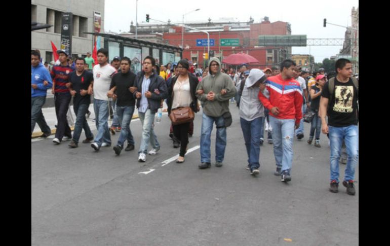 México | Abogan la libertad de los aprehendidos en las protestas del 20 de noviembre Marchan rumbo al Zócalo por los 11 detenidos Abogan la libertad de los aprehendidos en las protestas del 20 de noviembre Por: SUN 25 de noviembre de 2014 - 16:41 hs Los manifestantes caminan por el Paseo de la Reforma en la Ciudad de México. NTX / ARCHIVO CIUDAD DE MÉXICO (25/NOV/2014).- Cerca de 300 personas salieron la tarde de este martes del Ángel de la Independencia como parte de la marcha "Somos 43 más 11", que se programó para llegar al Zócalo capitalino y abogar por la libertad de los detenidos en las protestas del pasado 20 de noviembre en el centro de esta capital. La Secretaría de Seguridad Pública del Distrito Federal informó que tras presentarse manifestantes en Paseo de la Reforma y Avenida Juárez se buscaron vías alternas para los automovilistas. Temas SSPDF Estados Distrito Federal Manifestaciones en la Cd. de México Detenidos en México Recibe las últimas noticias en tu e-mail Todo lo que necesitas saber para comenzar tu día Registrarse implica aceptar los Términos y Condiciones