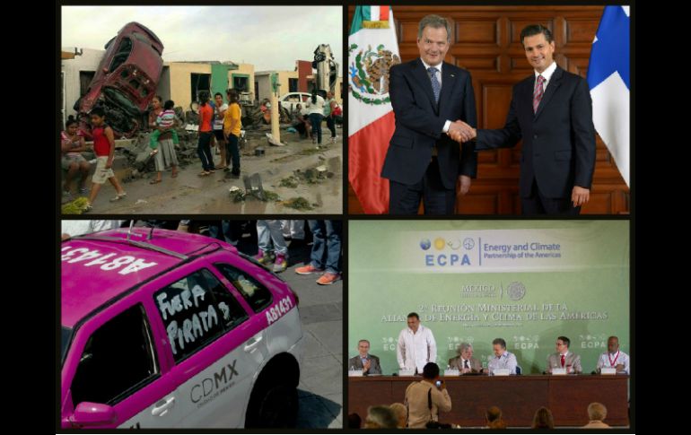 México | Síntesis informativa de lo más relevante en los medios de Periódicos Asociados en Red México en resumen: las noticias del 25 de mayo Síntesis informativa de lo más relevante en los medios de Periódicos Asociados en Red Por: EL INFORMADOR 25 de mayo de 2015 - 21:56 hs Los protagonistas de las noticias más relevantes del día de hoy. ESPECIAL / GUADALAJARA, JALISCO (25/MAY/2015).- Revisa lo más importante del 25 de mayo en México en este resumen de noticias publicadas a través de los sitios web de los medios que conforman los Periódicos Asociados en Red. CIUDAD DE MÉXICOTaxistas alcanzan acuerdo; habrá operativo contra 'taxis piratas' Tras la reunión entre una comitiva de 15 integrantes del grupo de 'Taxis Unidos' y autoridades del Gobierno del Distrito Federal concluyó la movilización que dicho grupo encabezó este lunes en diversos puntos de la Ciudad de México en contra de las empresas Uber y Cabify, así como de taxis piratas. Peña Nieto supervisará daños en Acuña tras tornado El Presidente dio un mensaje durante el evento de bienvenida al presidente de Finlandia, en el que externó su apoyo a la comunidad de Ciudad Acuña. COAHUILATornado de Acuña, uno de los más fuertes ocurridos en México El tornado ocurrido en Ciudad Acuña, fue catalogado como uno de los fenómenos más fuertes acontecido en los últimos 15 años en México, manifestó la Comisión Nacional del Agua (Conagua). JALISCOCongreso de Jalisco busca padrón de víctimas del 1 de mayo Desde el pasado 13 de mayo, el pleno del Congreso del Estado votó un punto de acuerdo para solicitar la información de las víctimas de los atentados y bloqueos del 1 de mayo. Sin embargo, la Fiscalía General del Estado no ha informado cuántas personas fueron afectadas ni cuáles bienes podrían ser reparadas por el estado. MICHOACÁNEntregan 34 cuerpos a familiares tras enfrentamiento en Tanhuato La responsable del área de comunicación social de la Procuraduría de Justicia de Michoacán, Magdalena Guzmán Rosas, informó que 34 cuerpos de los 42 presuntos delincuentes abatidos por fuerzas federales en el municipio de Tanhuato ya fueron entregados a sus familiares. YUCATÁNReforma energética apuesta a energías limpias: Coldwell El secretario de Energía, Pedro Joaquín Coldwell, destacó que la reforma energética mexicana le apuesta al impulso de las energías limpias y va por la creación de un mercado mayorista. Temas Estados Agencia PAR Reporte México Lee También Reformas a Ley de Amparo no limita derechos ciudadanos Festival del Pan de Muerto en CDMX: Fechas, horarios y actividades "Raymond" baja su potencia, pero tocará tierra en horas En Hidalgo, caminos destrozados complican rescates y ayuda Recibe las últimas noticias en tu e-mail Todo lo que necesitas saber para comenzar tu día Registrarse implica aceptar los Términos y Condiciones