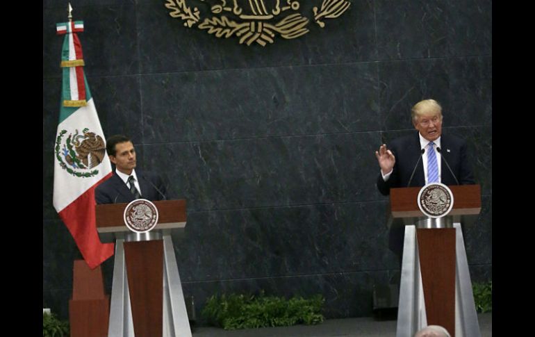 GUADALAJARA, JALISCO (01/SEP/2016).- Luego de su encuentro privado con el Presidente Enrique Peña Nieto en la residencia oficial de Los Pinos, el candidato republicano Donald Trump aseguró que, para velar por la “seguridad y la economía de Estados Unidos y México” y poner un alto a la inmigración ilegal, “es necesario construir un muro”.Al ser cuestionado sobre su idea de que México pagara por la construcción de la muralla en la frontera entre ambos países, el magnate señaló: “Hablamos sobre la necesidad del muro, pero no discutimos quién pagará por él”.Después de la conferencia de prensa, Enrique Peña Nieto aclaró en redes sociales: “Al inicio de la conversación con Donald Trump dejé claro que México no pagará por el muro”. Sin embargo, Trump cambió el discurso por la noche desde Arizona: “México va a pagar por ese muro. Cien por ciento”.Antes, el candidato republicano señaló que la reunión con el mandatario fue breve, pero muy productiva. Y aseguró estar honrado por la invitación para la conversación que le extendió el Ejecutivo mexicano, misma que también recibió la candidata demócrata a la Casa Blanca, Hillary Clinton.Donald Trump aseguró sentir “un gran respeto por los mexicoestadounidenses. Le doy empleo a muchos, muchos amigos vienen de México y me enorgullece hablar de la gente a la que le doy empleo. Conozco a mexicanos de primera, segunda y tercera generación que viven en Estados Unidos y respeto mucho su amor por la familia, su fe y toda su comunidad”.Señaló que en el encuentro privado habló con Peña Nieto sobre cinco puntos principales.En primer lugar, poner un alto a la inmigración ilegal. “No sólo entre nosotros sino desde Centroamérica y de otras Regiones que ponen en peligro nuestras finanzas y nuestra seguridad. La crisis migratoria es un desastre en materia humanitaria, y es algo que se tiene que resolver rápido. No es justo para nadie”.En segundo lugar, hablaron sobre la seguridad en la frontera en común. Trump aseguró que es un derecho soberano de Estados Unidos y reiteró su plan de construir un muro.“Tenemos que cuidar y velar por la seguridad de ambas naciones. Es necesario poner un muro para poner un alto a la inmigración ilegal y al flujo de armas y de efectivo. Tiene que ser un objetivo de seguridad compartido”.En tercer lugar abordaron la lucha contra el narcotráfico y los cárteles de la droga: “Tenemos que poner un alto. Esto sólo puede hacerse compartiendo información de inteligencia y actuando de manera conjunta”.En cuarto lugar, el candidato republicano señaló que es necesario mejorar el Tratado de Libre Comercio de América del Norte (TLCAN), y aseguró que el acuerdo ha beneficiado más a México que a Estados Unidos. Por ello, “debe revisarse por el bien de los trabajadores de ambas naciones para que sea un comercio recíproco”.Por último, abordó con Peña Nieto la necesidad de cuidar la industria manufacturera en el hemisferio. “No podemos permitir que se vaya a otros continentes porque eso afecta nuestro mercado laboral y afecta directamente la situación en la frontera”.Al finalizar su mensaje durante la conferencia de prensa, Trump afirmó que siente un “profundo respeto” por el Presidente Enrique Peña Nieto, y lo llamó amigo.PIDE RESPETO PARA LOS MEXICANOSLos mexicanos en Estados Unidos son gente honesta, trabajadora, que respetan la familia y la ley, ayudan al desarrollo de ese país. Son personas de bien, expresó ayer el Presidente Enrique Peña Nieto, en el mensaje que ofreció tras su reunión privada con Donald Trump.“Sr. Trump, mi prioridad como Presidente de México y la de mi Gobierno, es proteger a los mexicanos, donde quiera que ellos se encuentren”, indicó Peña Nieto.Señaló que el proceso electoral en Estados Unidos será un proceso de “intenso debate, contraste de ideas y participación ciudadana”. Destacó que el próximo mandatario de Estados Unidos encontrará en México y su Gobierno a un vecino que desea trabajar constructivamente.Reiteró la invitación para entablar un diálogo sobre un “futuro compartido”.“La frontera debe transformarse en un activo para nuestra Región, lo que necesitamos es un enfoque integral acerca de la frontera.Reconoció a Trump por su decisión de sostener un diálogo constructivo pues enfatizó que el diálogo es el camino porque acerca a los que piensan distinto y permiten lograr un mayor entendimiento.LAS FRASES DEL ENCUENTROPeña Nieto“Podemos no estar de acuerdo en diversos temas, pero su presencia muestra que tenemos una coincidencia: nuestros países son muy importantes el uno para el otro”.“Nuestro país le compra más a Estados Unidos que Alemania, España Francia, Italia, Japón y Reino Unido juntos”.“La frontera debe transformarse en un activo para nuestra Región”.“Muchas vidas pueden salvarse de los dos lados de la frontera si los grupos criminales dejan de recibir armas”.“Dejé claro que México no pagará por el muro”.“Los mexicanos en Estados Unidos son gente honesta, que respetan la vida, la familia y la ley. Por lo tanto, merecen el respeto de todos”.“Mi prioridad es proteger a los mexicanos… esa es mi responsabilidad y la seguiré cumpliendo”.Trump“Señor Presidente (Peña Nieto) es un tremendo honor y lo considero un amigo”.“Los mexicanos no tienen ningún reproche… los mexicanos son personas espectaculares”.“Le doy empleo a muchos mexicanos, muchos amigos vienen de México y me enorgullece hablar de la gente a la que le doy empleo”. “El tráfico de personas desde Centroamérica es sumamente peligroso, sin ningún tipo de autoridad y sin papeles”.“Tenemos que construir un muro para detener el flujo de armas y dinero… garantizar la seguridad de todos los ciudadanos”.“No hablamos de quién va a pagar por el muro. No. Eso no lo hablamos”.“Tenemos que mejorar el Tratado de Libre Comercio (entre Estados Unidos,