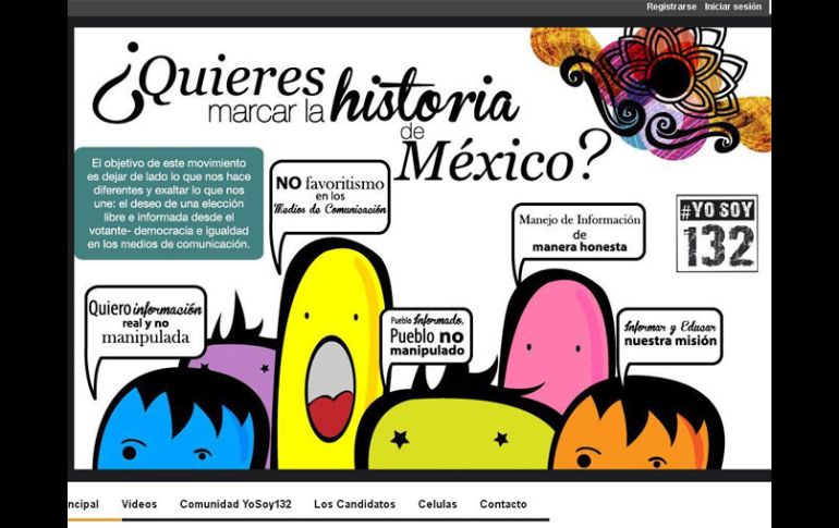 México | La plataforma web, exponen, es 100% independiente de partidos políticos Movimiento #YoSoy132 crea página web En el sitio pueden consultarse videos que han realizado a partir de sus denuncias de manipulación informativa Por: SUN 23 de mayo de 2012 - 14:09 hs Página principal del sitio web. ESPECIAL / CIUDAD DE MÉXICO (23/MAY/2012).- El movimiento de universitarios #YoSoy132 creo un sitio web con el mismo nombre -http://yosoy132.mx//- un foro de "expresión libre y abierto" con el objeto de concentrar todas las voces y rostros de quienes "exigimos un México mejor". La plataforma web, exponen, es 100% independiente de partidos políticos y sin ningún tipo de preferencia partidista. "Nos permitirá alzar la voz y exigir a quien sea nuestro futuro Presidente/a, diputados y senadores de todos los partidos políticos los cambios que merece nuestro país, y exigimos Todos!". La única regla para ingresar a este portal es mantener las exigencias y demandas objetivas del movimiento YoSoy132, "sin agresiones, absolutamente pacificas". En el sitio pueden consultarse videos que han realizado a partir de sus denuncias de "manipulación informativa"; las marchas realizadas por estudiantes de la Universidad Iberoamericana y del Instituto Tecnológico Autónomo de México (ITAM) a Televisa Santa Fe y San Ángel, foros de discusión y las células para comenzar a identificar a los diferentes colectivos de este movimiento, se sugiere usar un explorador que lea páginas en código abierto. Temas Manifestaciones en México Medios de comunicación Elecciones México 2012 #YoSoy132 Lee También Clima en Ciudad de México hoy: el pronóstico para el sábado 11 de octubre de 2025 Hoy No Circula Sabatino: Autos que descansan este 11 de octubre en CDMX y Edomex CURP biométrica : ¿Dónde sacar cita para el trámite en CDMX? Detienen a Lex Ashton 'N' por homicidio y tentativa de homicidio Recibe las últimas noticias en tu e-mail Todo lo que necesitas saber para comenzar tu día Registrarse implica aceptar los Términos y Condiciones