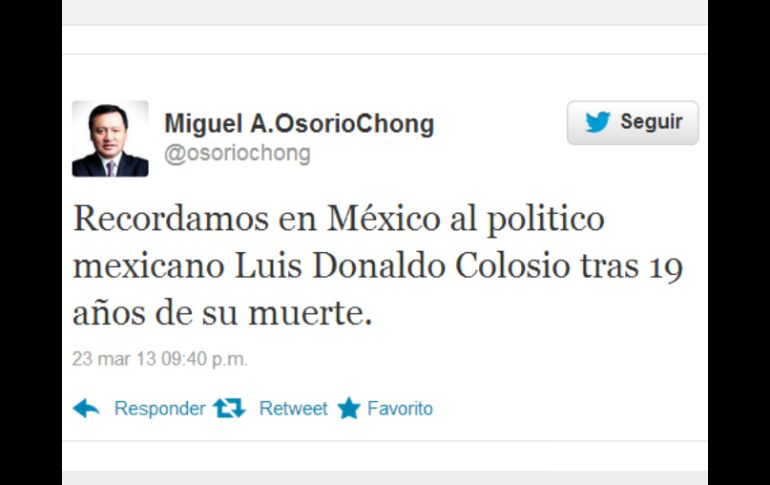 México | El secretario de Gobernación recuerda a Colosio luego de su asesinato Osorio Chong recuerda a Colosio a 19 años de su muerte El secretario de Gobernación recuerda a Colosio luego de su asesinato hace 19 años en Lomas Taurinas, Tijuana Por: NTX 23 de marzo de 2013 - 20:00 hs CIUDAD DE MÉXICO (23/MAR/2013).- El secretario de Gobernación, Miguel Ángel Osorio Chong, destacó al político mexicano Luis Donaldo Colosio, quien fue asesinado hace 19 años en la colonia Lomas Taurinas, en Tijuana, Baja California. "Recordamos en México al político mexicano Luis Donaldo Colosio tras 19 años de su muerte", escribió el funcionario en su cuenta de Twitter. El ex candidato presidencial del Partido Revolucionario Institucional (PRI) fue asesinado el 23 de marzo de 1994 por el michoacano Mario Aburto Martínez. Luis Donaldo Colosio nació el 10 de febrero de 1950 en Magdalena de Kino, Sonora, y de 1988 a 1992 se desempeñó como presidente nacional del PRI. Temas Política PRI Luis Donaldo Colosio Aniversario luctuoso Miguel Ángel Osorio Chong Lee También José Jerí asume como presidente de Perú Congreso de Perú destituye como presidenta a Dina Boluarte La distopía de Clara Brugada Se encienden las alarmas Recibe las últimas noticias en tu e-mail Todo lo que necesitas saber para comenzar tu día Registrarse implica aceptar los Términos y Condiciones
