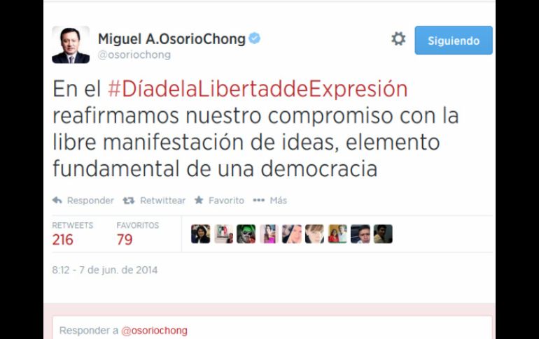 México | La libre manifestación es un ''elemento fundamental de una democracia'', dice Osorio Chong refrenda compromiso con la libertad de expresión La libre manifestación es un ''elemento fundamental de una democracia'', dice el funcionario Por: ESPECIAL 7 de junio de 2014 - 11:51 hs El secretario utiliza el hashtag #DíadelaLibertaddeExpresión para recordar una de las prioridades del Gobierno federal. ESPECIAL / CIUDAD DE MÉXICO (07/JUN/2014).- El secretario de Gobernación, Miguel Ángel Osorio Chong, refrendó el compromiso del Gobierno federal con la libertad de expresión y la manifestación de ideas en México. A través de su cuenta de Twitter; @osoriochong, el funcionario escribió: "En el #DíadelaLibertaddeExpresión reafirmamos nuestro compromiso con la libre manifestación de ideas, elemento fundamental de una democracia". La libre manifestación de las ideas está consagrada en la Carta Magna en los artículos 6 y 7. El gobierno del presidente Miguel Alemán Valdés, estableció el 7 de junio de 1951 como el Día de la Libertad de Expresión en México. Temas Libertad de Expresión Twitter Miguel Ángel Osorio Chong Lee También El acoso judicial amenaza la libertad de expresión: SIP El Tri Sub-17 femenil va por la revancha mundialista en Marruecos Teatro Diana: Cartelera de eventos de este fin de semana Tania Libertad celebra 45 años de canto, amor y libertad en México Recibe las últimas noticias en tu e-mail Todo lo que necesitas saber para comenzar tu día Registrarse implica aceptar los Términos y Condiciones