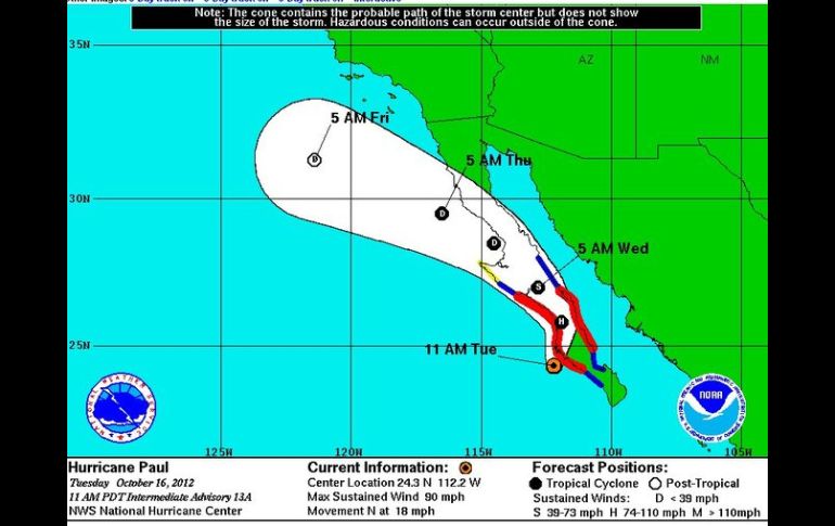 México | El huracán registra vientos máximos sostenidos de 150 kilómetros por hora 'Paul' se debilita a categoría uno A las 18:00 horas GMT el vórtice del meteoro se ubicaba a 70 kilómetros al sur del Cabo San Lázaro Por: NTX 16 de octubre de 2012 - 14:37 hs El ojo de 'Paul' tocará tierra en las próximas horas. ESPECIAL / CIUDAD DE MÉXICO (16/OCT/2012).- El huracán 'Paul' se debilitó hoy a categoría uno al aproximarse a Cabo San Lázaro, en la costa oeste de la península de Baja California, informó el Centro Nacional de Huracanes (CNH) de Estados Unidos. 'Paul' todavía tiene vientos máximos sostenidos de 150 kilómetros por hora y a las 18:00 horas GMT el vórtice del meteoro se ubicaba a 70 kilómetros al sur del Cabo San Lázaro, indicó la dependencia. En la trayectoria pronosticada, el ojo de 'Paul' tocará tierra "en las próximas horas" en algún punto en la zona, que se encuentra bajo aviso de huracán y que va de Santa Fe hacia el norte, a Punta Abreojos. Una vez que toque tierra, 'Paul' seguirá debilitándose mientras se desplaza sobre la Península de Baja California y su trayectoria dará un giro hacia el noroeste. Temas Estados Clima Baja California Recibe las últimas noticias en tu e-mail Todo lo que necesitas saber para comenzar tu día Registrarse implica aceptar los Términos y Condiciones