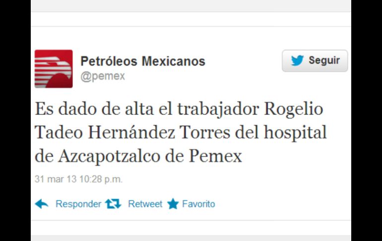 México | Rogelio Tadeo Hernández salió del Hospital Azcapotzalco de Pemex Pemex reporta alta médica de otro herido en explosión Rogelio Tadeo Hernández salió del Hospital Azcapotzalco de Pemex Por: NTX 31 de marzo de 2013 - 18:25 hs La paraestatal dio a conocer la información a través de su cuenta en Twitter. TOMADA DE @pemex / CIUDAD DE MÉXICO (31/MAR/2013).- Petróleos Mexicanos (Pemex) dio a conocer que fue dado de alta un trabajador y permanecen hospitalizados dos más luego de la explosión ocurrida el 31 de enero pasado en la torre B2 de las oficinas de la paraestatal. En su cuenta de Twitter, la empresa informó que fue "dado de alta el trabajador Rogelio Tadeo Hernández Torres del hospital de Azcapotzalco de Pemex". En tanto, la Secretaría de Salud informó que los dos pacientes que aún permanecen hospitalizados se encuentran en estado delicado; uno en el Hospital Central Pemex Norte y el otro en el Centro de Neurorehabilitación Ángeles. Temas Pemex Explosiones en el Distrito Federal Estados Ciudad de México Recibe las últimas noticias en tu e-mail Todo lo que necesitas saber para comenzar tu día Registrarse implica aceptar los Términos y Condiciones