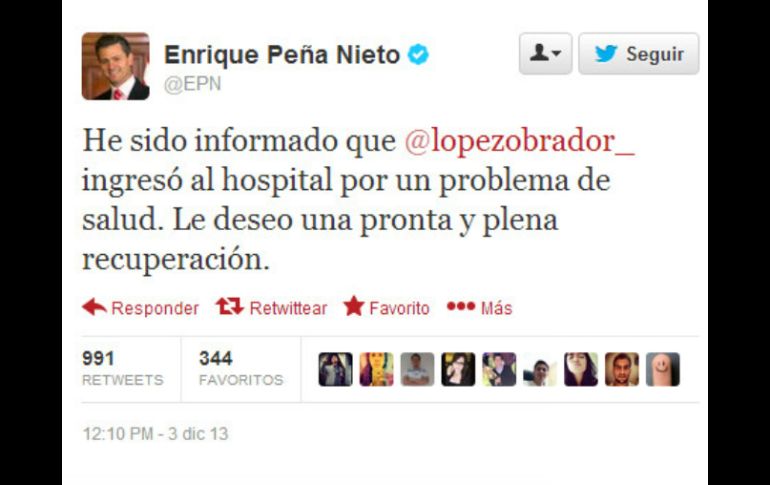 México | Se ha dado a conocer que Andrés Manuel se encuentra hospitalizado Peña Nieto desea pronta recuperación a López Obrador Se ha dado a conocer que Andrés Manuel se encuentra hospitalizado Por: EL INFORMADOR 3 de diciembre de 2013 - 12:33 hs Hasta el momento, el Mandatario ha sido el primero en compartir sus buenos deseos al dirigente de Morena. ESPECIAL / GUADALAJARA, JALISCO (03/DIC/2013).- A través de su cuenta de Twitter, el Presidente de México, Enrique Peña Nieto deseó un pronta recuperación a Andrés Manuel López Obrador, luego de que se diera a conocer que este último se encuentra hospitalizado, según fuentes del Gobierno del Distrito Federal. El tuit menciona "He sido informado que @lopezobrador_ ingresó al hospital por un problema de salud. Le deseo una pronta y plena recuperación." Hasta el momento, el Mandatario ha sido el primero en compartir sus buenos deseos al dirigente del Movimiento de Regeneración Nacional (Morena), del que hasta ahora se desconoce su estado de salud. Temas Gobierno de México Enrique Peña Nieto AMLO Twitter Recibe las últimas noticias en tu e-mail Todo lo que necesitas saber para comenzar tu día Registrarse implica aceptar los Términos y Condiciones