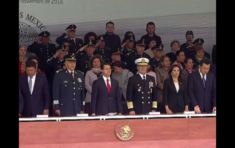 CIUDAD DE MÉXICO (20/NOV/2016).- El Presidente Enrique Peña Nieto encabeza este domingo la ceremonia conmemorativa del 106 Aniversario de la Revolución Mexicana, en el que entregará 47 condecoraciones y ascensos a elementos de las Fuerzas Armadas. En el acto que se realiza en el Campo Marte, el Mandatario federal está acompañado por los titulares de las secretarías de la Defensa Nacional (Sedena), Salvador Cienfuegos Zepeda, y de Marina (Semar), Vidal Francisco Soberón Sanz. El titular del Ejecutivo federal otorga condecoraciones a 11 elementos de la Sedena y a nueve de la Marina, en tanto que los ascensos corresponderán a 18 de militares y nueve de marinos. En el acto, al que también acuden los presidentes de la Cámara de Diputados, Edmundo Javier Bolaños Aguilar, y de la Suprema Corte de Justicia de la Nación, Luis María Aguilar Morales, también se entregarán de manera simultánea 669 ascensos y condecoraciones al personal que permanecerá en formación en este lugar. Luego del mensaje que emitirá el Presidente Peña Nieto, se llevará a cabo un espectáculo músico-militar y diversas evoluciones por parte de las bandas de música y de guerra representativas de las Fuerzas Armadas. Asimismo, se realizará una verbena revolucionaria, se escuchará música de mariachi, se entonará el Himno Nacional y finalmente se realizará el sobrevuelo de nueve aviones del Ejército.