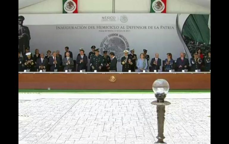 CIUDAD DE MÉXICO (14/JUL/2017).- El Presidente Enrique Peña Nieto inauguró el Hemiciclo al Defensor de la Patria, en el Bosque de Chapultepec, en conmemoración de la Victoria de la República de 1867.Acompañado por los secretarios de la Defensa Nacional, Salvador Cienfuegos; de Marina, Vidal Soberón; de Gobernación, Miguel Ángel Osorio, y de la Función Pública, Arely Gómez, el Ejecutivo federal también develó la estatua al "defensor de la Patria", la imagen emblemática del soldado mexicano.El monumento que inauguró Peña Nieto consta de un mural metálico en alto relieve, montado en un muro de mármol blanco.Aparecen soldados de cuatro épocas de la historia de México, con cinco símbolos: la campaña de Independencia, un pliego del nacimiento de México, un carruaje juarista, el monumento a la Revolución y la Constitución de 1917.Hidalgo, Morelos, Juárez, Madero y Carranza parecen en el primer plano del mural.El monumento se localiza sobre la calzada Chivatito, en el área posterior del Campo Marte.En la parte alta del monumento una leyenda dice unas palabras del Himno Nacional: "Piensa o Patria querida, que el cielo un soldado en cada hijo te dio".En la ceremonia el presidente Peña Nieto entregó reconocimientos a nueve personalidades, entre ellas la historiadora Patricia Galeana y Miguel Alemán Velasco.