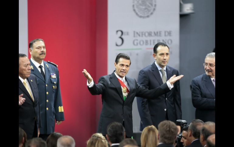 México | El Presidente presenta un mensaje a la Nación desde el Palacio Nacional Peña Nieto inicia mensaje por Tercer Informe de Gobierno El Presidente presenta un mensaje a la Nación desde el Palacio Nacional Por: EL INFORMADOR 2 de septiembre de 2015 - 11:13 hs CIUDAD DE MÉXICO (02/SEP/2015).- Desde Palacio Nacional, el Presidente Enrique Peña Nieto inició el mensaje que, con motivo de su Tercer Informe de Gobierno, dirige al pueblo de México para comunicar el estado que guarda la Nación. El Mandatario agradeció la presencia de su esposa, sus hijos, y la de los representantes de los Poderes de la Unión. Los invitados De acuerdo con cifras proporcionadas por la Presidencia, hay mil 500 invitados y más de 500 periodistas nacionales e internacionales acreditados para este evento. Sólo habrá un orador, que será el Presidente de la República. Al frente del foro preparado para este evento, se ha instalado un atril y de un costado, sillas para los integrantes del Gabinete y los presidentes de las cámaras de Diputados y Senadores, y al otro costado, sillas para los gobernadores y el jefe de Gobierno del Distrito Federal. Han sido invitados a este evento legisladores, integrantes de la Suprema Corte, líderes empresariales, jerarcas religiosos, la plana mayor de las Fuerzas Armadas, líderes sindicales, integrantes del cuerpo diplomático acreditado en México y dueños de medios de comunicación. Entre las personalidades que se encuentran ya esperando el informe está el rector de la UNAM, José Narro, así como gobernadores electos, entre ellos, el nuevoleonés Jaime Rodríguez Calderón, el gobernador del Banco de México, Agustín Carstens y el ex candidato presidencial Diego Fernández de Cevallos, entre otros. Llegan funcionarios a Palacio Nacional Funcionarios, líderes de partidos, senadores y diputados, comienzan a arribar al Palacio Nacional para presenciar el mensaje por el tercer informe de labores de la administración de Enrique Peña Nieto al frente del Poder Ejecutivo. En medio de un fuerte dispositivo de seguridad y vallas que cercaron el inmueble, los invitados arribaron por la puerta principal para que alrededor del mediodía dé inicio el mensaje del Presidente de la República. Entre los invitados están los gobernadores de los estados, líderes de partidos como Ricardo Anaya por el PAN, César Camacho por el PRI y Carlos Navarrete por el PRD, entre otros. En la entrada se pudo ver al coordinador de los senadores panistas, Roberto Gil Zuarth; el gobernador electo de Nuevo León, Jaime Rodríguez (El Bronco), y a la titular de la asociación civil Alto al Secuestro, Isabel Miranda de Wallace. Temas Gobierno de México Enrique Peña Nieto Informe de Gobierno Lee También Morelos reporta siete muertos tras lluvias de las últimas horas Liverpool: ¡Laptops en menos de 5 mil pesos que no te puedes perder! Zague aseguró que "no existe calidad" en el futbol mexicano Suman 44 muertos y miles de damnificados por lluvias en cinco estados Recibe las últimas noticias en tu e-mail Todo lo que necesitas saber para comenzar tu día Registrarse implica aceptar los Términos y Condiciones