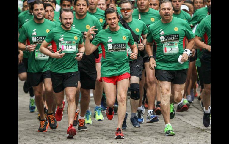 CIUDAD DE MÉXICO (15/JUL/2017).- Al filo de las 08:00 horas el Presidente Enrique Peña Nieto inició la séptima carrera de Molino Rey, en la que el Mandatario recorrerá junto a sus principales colaboradores 10 kilómetros.Esta será la quinta vez que el Presidente Peña participa en esta convivencia que se desarrolla en el Bosque de Chapultepec.En julio de 2013 el mandatario recorrió los 10 kilómetros en 54 minutos con 12 segundos, al año siguiente lo realizó en 53 minutos y un segundo.Para 2015 redujo su tiempo en casi tres segundos para terminar el recorrido en 50 minutos con 48 segundos y el año pasado terminó con un registro de 53 minutos y 10 segundos.En esta carrera presidencial han participado secretarios de Estado y directores de dependencias así como integrantes del Staff de Los Pinos.Algunos de los funcionarios que acompañan al Presidente son el secretario de Medio Ambiente, Rafael Pacchiano; el secretario de Turismo, Enrique de la Madrid; el jefe de la Oficina de la Presidencia , Francisco Guzmán Ortiz; el director general del IMSS, Mikel Arriola Peñalosa; el gobernador de Oaxaca, Alejandro Murat; el titular de la Conade, Alfredo Castillo; la jefa delegacional de Miguel Hidalgo, Xóchitl Gálvez; el jefe del Estado Mayor Presidencial, Roberto Miranda y Alejandra Lagunes, titular de la estrategia digital del Gobierno federal, entre otros.
