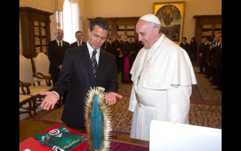 México | La playera verde está firmada por los jugadores de la Selección Mexicana Peña Nieto regala al Papa Francisco camiseta del Tri La playera verde está firmada por los jugadores de la Selección Mexicana Por: NTX 7 de junio de 2014 - 07:25 hs El Papa agradece con una sonrisa el obsequio del Presidente de México. AFP / CIUDAD DEL VATICANO (07/JUN/2014).- El Presidente de México, Enrique Peña Nieto, regaló hoy al Papa Francisco la camiseta de la Selección Mexicana de futbol durante una audiencia privada que sostuvieron en el Palacio Apostólico del Vaticano. "Ahora que está de moda, le queremos obsequiar la casaca de la Selección para que sepa que en México nos ponemos la camiseta", dijo el Mandatario mientras le mostraba la playera color verde firmada por los jugadores del equipo tricolor. El Papa agradeció con una sonrisa. Al inicio de la ceremonia ambos se saludaron en la Sala del Troneto, la antecámara de la biblioteca, a las 13:02 hora local (11:02 GMT). Luego ambos pasaron a un gran salón y se sentaron ante un escritorio de madera. Por unos minutos los fotógrafos y periodistas pudieron asistir al inicio de su diálogo, luego se cerró la puerta y comenzó el cara a cara. Tras los 25 minutos de coloquio tuvo lugar un intercambio de regalos. Luego de saludar de mano a cada uno de los miembros de la delegación, el Papa acompañó al Presidente hasta la puerta y ambos se despidieron amistosamente. Luego, Peña Nieto se dirigió hasta el primer piso del Palacio Apostólico donde fue recibido en una audiencia, también privada, por el "número dos" del Vaticano, el secretario de Estado Pietro Parolin, quien estará acompañado por el responsable para las Relaciones con los Estados, Dominique Mamberti. Mientras ellos dialogaban cara a cara, en un coloquio que duró 25 minutos, en la Sala del Angulo esperaba el resto de la delegación compuesta por la primera dama Angélica Rivera, y tres de sus hijos. Allí esperaron también los secretarios de Relaciones Exteriores, José Antonio Meade; de Hacienda, Luis Videgaray; de Comunicaciones y Transportes, Gerardo Ruiz Esparza; de Economía, Ildefonso Guajardo; Villarreal; y de Medio Ambiente y Recursos Naturales, Juan José Guerra Abud. Además de la secretaria de Turismo, Claudia Ruiz Massieu; el Procurador General de la República, Jesús Murillo Karam; así como de los embajadores mexicanos ante la sede de la Iglesia católica, Mariano Palacios Alcocer; y ante Italia, Miguel Ruíz Cabañas. Tras el coloquio privado, el Presidente presentó al Papa uno a uno a los miembros de su comitiva. El ambiente era distendido y cordial, luego se pasó a un intercambio de regalos. Fue entonces cuando ambos se acercaron a una mesita cercana donde se encontraba la casaca mexicana colocada en una caja de color rojo con un sobre blanco encima que rezaba: "Para Su Santidad Francisco". El presidente mexicano ofreció un obsequio adicional: una estatua de madera de la Virgen de Guadalupe. "Es la reina de México y emperatriz de América", señaló. A cambio el obispo de Roma le ofreció un gran medallón y le explicó que contenía la imagen de la Plaza de San Pedro antes de ser concluida en su construcción. "Me permito regalarle un ejemplar de la exhortación apostólica, acá encontrará varias partes, toda una parte dedicada al tema social. Yo se la doy, por si le sirve", dijo el Papa al entregar un ejemplar de su documento programático "Evangelii Gaudium" (La alegría del evangelio). "Claro que me servirá", apuntó Peña, antes de recordarle: "México le quiere y le respeta su Santidad, muchas gracias". Francisco fue entregando en mano a cada uno de los miembros del grupo un rosario, ellos le fueron saludando y saliendo de la sala. Cuando iban dirigiéndose a la salida, el mandatario mexicano se adelantó y comenzó a presentar él personalmente a otras personas que lo acompañaban en un pequeño grupo de periodistas. Al final se disculpó: "Perdón por el atrevimiento y por romper el protocolo. Usted lo rompe muchas veces y yo sigo su ejemplo". El Papa le sonrió varias veces asintiendo con la cabeza. Junto a él, su esposa señaló, dirigiéndose al Pontífice: "Te queremos mucho! Te queremos mucho!". Inmediatamente después Peña Nieto bajó un piso en el Palacio Apostólico para reunirse, también en privado, con el "número dos" del Vaticano, el secretario de Estado Pietro Parolin. Temas Gobierno de México Ciudad del Vaticano Selección mexicana Giras presidenciales Enrique Peña Nieto Papa Francisco Lee También Cartucho Clima en Ciudad de México hoy: el pronóstico para el viernes 10 de octubre de 2025 Mundial Sub-20: Chivas y Juárez se disputan el futuro del juvenil Diego Ochoa Aficionado le pide a Javier Aguirre que Gilberto Mora no pruebe el alcohol | VIDEO Recibe las últimas noticias en tu e-mail Todo lo que necesitas saber para comenzar tu día Registrarse implica aceptar los Términos y Condiciones