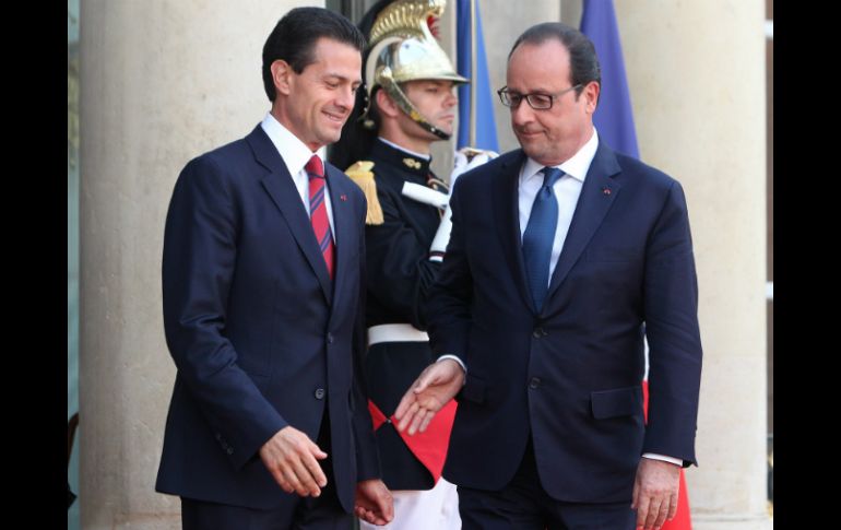 México | Es el último encuentro como parte de la visita de Estado del Presidente a Francia Peña Nieto y Hollande se reúnen en el Palacio del Elíseo Por la noche el presidente francés ofrecerá una cena en honor del Mandatario mexicano y su esposa, Angélica Rivera Por: NTX 16 de julio de 2015 - 11:34 hs PARÍS, FRANCIA (16/JUL/2015).- Los presidentes de México, Enrique Peña Nieto, y de Francia, François Hollande, iniciaron su último encuentro como parte de la visita de Estado que realiza el mandatario mexicano a tierra gala. El Ejecutivo Federal mexicano arribó la tarde del jueves al Palacio del Elíseo, donde fue recibido por su homólogo francés, para posteriormente ser invitado a pasar revista a las Tropas de Honor, a invitación del comandante de este agrupamiento. Previo a este acto, le Mandatario mexicano acudió a la ceremonia de entrega del Certificado de Inscripción a la Lista del Patrimonio Mundial de la nominación mexicana del Complejo Hidráulico del Acueducto del Padre Tembleque, en Hidalgo. Ya en el citado palacio, México y Francia firmaron una serie de acuerdos en materia de turismo, salud, ecología, al igual que la Declaración conjunta sobre la conferencia del cambio climático COP21, y un proyecto piloto de ciudad sustentable en Campeche. Asimismo, una declaración conjunta sobre la Casa de México, un convenio de desarrollo profesional por alternancia, así como uno para la formación de técnicos superiores universitarios e ingenieros en el sector energético, y uno más para el sector aeronáutico. Los presidentes de México y Francia también fueron testigos de la firma de una declaración de intención sobre cooperación en agricultura, ganadería y silvicultura, así como un memorándum de entendimiento, para iniciar la operación del modelo de avión A380, y en materia aeroespacial, un acuerdo de cooperación para el estudio del medio ambiente, el clima y los océanos. Después, ambos presidentes asistieron a las presentación del proyecto arquitectónico Casa Mexicana, para posteriormente intercambiar obsequios, y asistir al Encuentro con el Consejo Estratégico Franco-Mexicano. Mas tarde, como última actividad pública de la visita de Estado, Peña Nieto y Hollande emitirán un mensaje a los medios de comunicación, y por la noche el presidente francés ofrecerá una cena en honor del Mandatario mexicano y su esposa, Angélica Rivera. Temas Gobierno de México SRE Giras presidenciales Enrique Peña Nieto François Hollande Lee También Tras pacto con Coca Cola, México acuerda bajar impuestos a refrescos En un año ha disminuido la venta de refrescos en México: Inegi Condenarán delito de extorsión con hasta quince años de cárcel ¿Cuál es el mejor pan de muerto en CDMX y dónde comprarlo? Recibe las últimas noticias en tu e-mail Todo lo que necesitas saber para comenzar tu día Registrarse implica aceptar los Términos y Condiciones