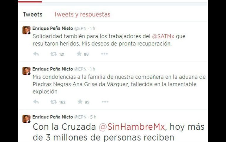 México | El Presidente expresa su solidaridad a los trabajadores que resultaron heridos Peña lamenta muerte de mujer tras explosión en Coahuila El Presidente expresa su solidaridad a los trabajadores que resultaron heridos Por: SUN 31 de agosto de 2014 - 16:57 hs 'Mis deseos de pronta recuperación', escribió el Mandatario en su cuenta de Twitter. ESPECIAL / CIUDAD DE MÉXICO (31/AGO/2014).- El Presidente Enrique Peña Nieto expresó su solidaridad a los trabajadores que resultaron heridos tras la explosión ocurrida la mañana de este domingo en la aduana de Piedras Negras, Coahuila. "Mis deseos de pronta recuperación", escribió el Mandatario mexicano en su cuenta de Twitter. El titular del Ejecutivo también manifestó sus condolencias a la familia de Ana Griselda Vázquez, quien falleció en la explosión. "Mis condolencias a la familia de nuestra compañera en la aduana de Piedras Negras Ana Griselda Vázquez, fallecida en la lamentable explosión", escribió. Esta mañana, seis empleados, en su mayoría inspectores de la aduana de Piedras Negras resultaron gravemente lesionados, con quemaduras hasta de tercer grado, debido a una explosión ocurrida en el complejo aduanal en el área de dormitorios. Temas Enrique Peña Nieto Estados Coahuila Explosiones Recibe las últimas noticias en tu e-mail Todo lo que necesitas saber para comenzar tu día Registrarse implica aceptar los Términos y Condiciones