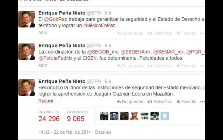 México | Funcionarios felicitan al Ejército y a la Marina por su labor en la detención Políticos reaccionan en Twitter tras la detención del 'Chapo' Funcionarios felicitan al Ejército y a la Marina por su labor en la detención Por: EL INFORMADOR 22 de febrero de 2014 - 18:16 hs Imagen del Twitter de Peña Nieto. ESPECIAL / GUADALAJARA, JALISCO (22/FEB/2014).- Tras la detención de Joaquín Guzmán Loera alias ' El Chapo', políticos de distintas instancias emitieron sus reacciones a través de sus cuentas de Twitter. Estos son algunos de los comentarios emitidos a través de la red social: " @EPN: Reconozco la labor de las instituciones de seguridad del Estado mexicano, para lograr la aprehensión de Joaquín Guzmán Loera en Mazatlán." "@osoriochong: Felicito a @SEDENAmx @SEMAR_mx @PGR_mx @PoliciaFedMx CISEN por el gran trabajo de coordinación para lograr la aprehensión de Joaquín Guzmán." "@AristotelesSD: La detención de Joaquín Guzmán devela coordinación e inteligencia de las fuerzas de seguridad en México. Mi reconocimiento #MéxicoEnPaz." "@ramirohdezg: Mi reconocimiento para el Presidente @EPN, las estrategias de seguridad de @GobRep garantizan el Estado de Derecho para un #MéxicoEnPaz." "@jc_ramirezmarin: Felicito al @GobRep y a las instituciones de seguridad por la exitosa detención de Joaquín 'El Chapo' Guzmán Loera." "@FMoctezumaP: Felicidades a @gobrep @EPN por la detención del #ChapoGuzmán @SEDENAmx @PGR_mx #marinanacional #CISEN." "@GoberDuarte: Reconozco el compromiso del Presidente @EPN para recuperar el Estado de Derecho, combatir la impunidad y lograr un #MéxicoEnPaz." "@SalgadoAbel: La detención del #Chapo representa un gran logro en el trabajo conjunto que las instituciones del país realizan en contra del crimen!." "@ManceraMiguelMX: Felicito al @gobrep por la detención de Joaquín 'El Chapo' Guzmán. Es una acción muy relevante en la lucha diaria contra la delincuencia #mm." "@jc_ramirezmarin: El @GobRep demuestra su compromiso en la defensa de la seguridad y salud de los mexicanos combatiendo al narcotráfico. #MéxicoEnPaz." "@faustovallejof: Mi reconocimiento al Presidente @EPN y a su Gabinete de Seguridad por lograr la aprehensión de Joaquín Guzmán Loera." El capo fue detenido esta mañana en el municipio de Mazatlán, Sinaloa, en una operación conjunta entre autoridades mexicanas y estadounidenses. EL INFORMADOR / PEDRO GARCÍA Temas Crimen Organizado Joaquín Chapo Guzmán Twitter Recibe las últimas noticias en tu e-mail Todo lo que necesitas saber para comenzar tu día Registrarse implica aceptar los Términos y Condiciones