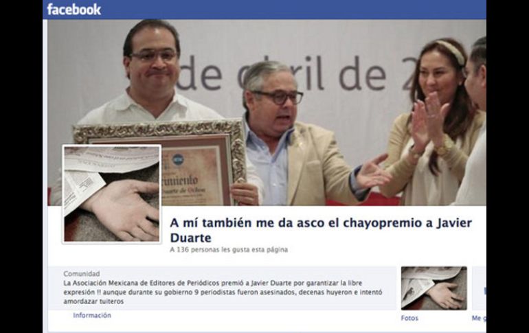 México | Javier Duarte recibe un reconomiento por su supuesta labor a favor de los periodistas Premio a gobernador de Veracruz genera rechazo en redes sociales Crean en Facebook la página ''A mí también me da asco el chayopremio…''; la organización internacional Artículo 19 dice que el premio es ''una burla'' Por: EL INFORMADOR 3 de abril de 2013 - 10:55 hs En Facebook, se crea la cuenta ''A mí también me da asco el chayopremio a Javier Duarte'', con ya varios seguidores. ESPECIAL / CIUDAD DE MÉXICO (03/ABR/2013).- El Gobernador de Veracruz, Javier Duarte de Ochoa, quien ayer recibió un premio por su supuesta labor a favor de los periodistas, ha generado una fuerte reacción de rechazo en las redes sociales Twitter y Facebook. El premio al mandatario veracruzano fue otorgado por la Asociación Mexicana de Editores de Periódicos AC, que reconoció “los esfuerzos que ha hecho Veracruz para garantizar el pleno ejercicio de la libertad de expresión”, además del “empeño” que ha mantenido Duarte de Ochoa por “proteger” a los comunicadores con la creación de la Comisión Estatal para la Atención y Protección de los Periodistas, lo que ese organismo considera “un marco legal inédito en el país y en el mundo”. Sin embargo, la organización internacional Artículo 19 dijo a SinEmbargo que premiar a Javier Duarte es “una burla”, porque está documentado que Veracruz se ha convertido en la entidad más peligrosa para ejercer el periodismo en México e incluso en América Latina. Darío Ramírez, director del capítulo México de la organización de protección a periodistas, expresó: “Es una evidencia más de lo mal que está el periodismo en México. En ningún lugar del mundo se premia a la autoridad por la labor que debe a hacer. Además la evidencia dice que Veracruz es el lugar más peligroso de América Latina para periodistas. Evidentemente este premio chayotero es una burla a todos los periodistas que han sido asesinados y desaparecidos en el estado”. Sólo en lo que va de su sexenio –tres años– nueve periodistas han sido ejecutados en esa entidad, sin que se hallan realizado investigaciones puntuales y con resultados convincentes para los familiares de las víctimas, expuso Artículo 19. En Facebook, un colectivo creó la cuenta “A mí también me da asco el chayopremio a Javier Duarte”, que desde esta mañana ha atraído ya a decenas de seguidores. Mientras, en Twitter, el hashtag #Chayopremio se está utilizado para criticar al mandatario de Veracruz. Algunas reacciones en Twitter losqueremosvivos @losqueremovivos Estos son los nueve periodistas asesinados en Veracruz en 13 meses en Veracruz http://goo.gl/jJDx1 #chayopremio Víctor Montufar @vmontufar RT @oliviazeron RT @marcelaturati A mí también me da asco el #chayopremio a @Javier_Duarte, gobernador de Veracruz http://fb.me/1BTxAkM2W +1 Morrison @PhantoVenom2m NUEVE Periodistas ASESINADOS en Veracruz en 13 meses Y Premian a Duarte Quesque por Proteger Periodistas http://goo.gl/jJDx1 #chayopremio Ecramsh @ecramsh1h Cuando aún puede seguirse burlando de la impunidad, la violencia y el homicidio de periodistas: @javier_duarte #chayopremio marcelaturati @marcelaturati3h A mí también me da asco el #chayopremio a @Javier_Duarte, gobernador de #Veracruz http://fb.me/1BTxAkM2W Con información de Sinembargo.mx Temas Periodismo Estados Veracruz Agresiones a periodistas Recibe las últimas noticias en tu e-mail Todo lo que necesitas saber para comenzar tu día Registrarse implica aceptar los Términos y Condiciones