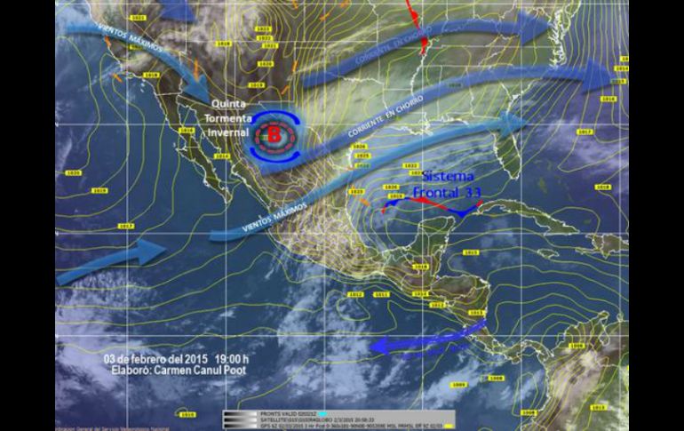 México | Se esperan precipitaciones pluviales en Jalisco, Colima, entre otros Prevén bajas temperaturas por frente frío 33 y tormenta invernal Se esperan precipitaciones pluviales de menor intensidad en Jalisco, Colima, Sinaloa, Durango, Nayarit, entre otros Por: NTX 3 de febrero de 2015 - 21:06 hs El SMN informa que el sistema frontal número 33 se extenderá sobre el oriente y sur del Golfo de México. TWITTER / @conagua_clima CIUDAD DE MÉXICO (03/FEB/2015).- El frente frío 33, aunado a la quinta tormenta invernal, provocarán bajas temperaturas en el centro del país, así como fuertes lluvias en las costas del sur, informó el Servicio Meteorológico Nacional ( SMN). El organismo informó que durante la noche de este martes el sistema frontal número 33 se extenderá sobre el oriente y sur del Golfo de México. Indicó que en interacción con la entrada de humedad proveniente del Golfo de México y Mar Caribe, el sistema favorecerá lluvias fuertes en Tabasco, Chiapas y Veracruz, y de menor intensidad en Oaxaca, Campeche, Yucatán y Quintana Roo. El aire asociado con ese sistema también mantendrá evento de norte con rachas de viento de 50 kilómetros por hora en Veracruz y Tabasco, y de hasta 70 kilómetros por hora en Oaxaca y Chiapas, condiciones que disminuirán paulatinamente. En tanto, la quinta tormenta invernal se ubica en el norte de Coahuila y se asocia con la fuerte entrada de humedad proveniente del Océano Pacífico, generando lluvias fuertes en Coahuila, Nuevo León y Tamaulipas. De igual forma, se esperan precipitaciones pluviales de menor intensidad en Chihuahua, Nayarit, Jalisco, Colima, Sinaloa, Durango, Aguascalientes, San Luis Potosí, Hidalgo, Zacatecas, Michoacán, Guanajuato, Estado de México, Distrito Federal, Tlaxcala, Puebla y Guerrero. Para este miércoles, se prevé que el frente frío 33 se extienda en el oriente del Golfo de México y la costa de Veracruz, e interactuará con la entrada de humedad del Océano Pacífico, Golfo de México y Mar Caribe. Por lo anterior, se pronostica que se originarán nublados y lluvias fuertes en áreas de Campeche, Yucatán y Quintana Roo, y de menor intensidad en zonas de Tamaulipas, Veracruz, Tabasco, Oaxaca y Chiapas. Aunque se pronostica un ascenso gradual de las temperaturas en el día, durante la mañana y la noche se mantendrán los valores menores a -5 grados, con potencial de heladas, en Chihuahua y Durango. Al respecto, el SMN detalló que las temperaturas podrían llegar a ser de -5 a cero grados en San Luis Potosí, Zacatecas, Aguascalientes, Hidalgo, Puebla, Estado de México y Tlaxcala. Además, los termómetros podrían marcar valores de cero a cinco grados en Baja California, Sonora, Coahuila, Nuevo León, Guanajuato, Querétaro, y zonas montañosas de Veracruz y Oaxaca, entidades en las que también hay pronóstico de heladas. Por otra parte, un sistema de circulación anticiclónica dominará gran parte de México y originará condiciones meteorológicas estables, con descenso en el potencial de lluvias e incremento de las temperaturas. El SMN exhortó a la población a mantenerse informada sobre las condiciones meteorológicas mediante la cuenta de Twitter @conagua_clima y en las páginas de internet smn.conagua.gob.mx y www.conagua.gob.mx Temas Estados Frío Clima SMN Lee También Poza Rica, inundado por desbordamiento del río Cazones Bad Bunny permanece sentado durante "God Bless America" y enciende las redes Bajan lluvias el sábado en Guadalajara, pero se mantiene nublado Lista actualizada de selecciones que ya clasificaron al Mundial 2026 Recibe las últimas noticias en tu e-mail Todo lo que necesitas saber para comenzar tu día Registrarse implica aceptar los Términos y Condiciones
