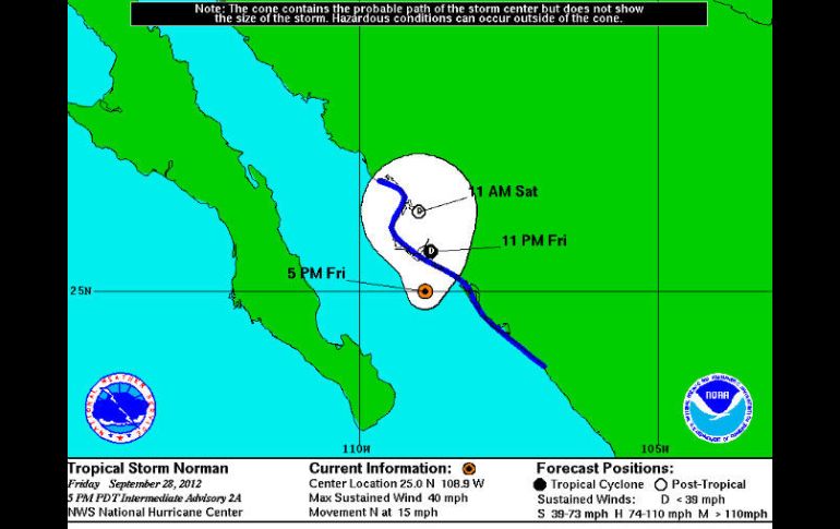 México | La tormenta tropical entraría en la zona de la bahía de Altata, municipio de Navolato Prevén que 'Norman' toque tierra en Sinaloa este sábado El último pronóstico señala que la tormenta tropical entraría en la zona de la bahía de Altata, municipio de Navolato Por: EL INFORMADOR 28 de septiembre de 2012 - 18:51 hs Tocaría tierra en la zona de la bahía de Altata, municipio de Navolato. ESPECIAL / CULIACÁN, SINALOA (28/SEP/2012).- La tormenta tropical 'Norman' estaría tocando tierra la tarde de este sábado en la zona de la bahía de Altata, municipio de Navolato, reportó la Dirección de Protección Civil de Sinaloa. El titular de la dependencia, Ismael Checa Landeros, dio a conocer, en entrevista, que el último pronóstico emitido por el Sistema Nacional de Protección Civil señala que la trayectoria del fenómeno meteorológico apunta hacia la zona centro de Sinaloa. "El último pronóstico es que la zona de impacto sería la parte centro de Navolato, a la altura de Altata", apuntó. Dijo que 'Norman' presenta rachas de vientos de 40 a 55 kilómetros por hora (km/h), pero que es fuerte el oleaje que se siente en La Cruz de Elota, municipio de Elota y en Altata. Según Gobernación, los efectos más importantes se presentan durante esta noche y la madrugada del día de mañana; principalmente lluvias, escurrimientos, crecimiento repentino en el caudal de los ríos y arroyos de respuesta rápida, posibles inundaciones en zonas urbanas; así como deslaves en zonas de sierra. En las próximas 24 horas se esperan afectaciones por lluvias, oleaje alto, marea de tormenta y vientos fuertes en Nayarit, Sinaloa, Baja California Sur, Sonora y Durango. Precipitaciones mayores de 150 mm acompañadas de tormentas eléctricas en el centro y norte de Sinaloa, el Norte y Occidente de Durango y sur de Sonora; lluvias que se pueden acentuar en zonas de sierra. Precipitaciones de 70 a 150 mm en el Sur de Chihuahua y centro de Sonora, gran parte del estado de Nayarit y Occidente de Jalisco. También precipitaciones de 50 a 70 mm en Zacatecas y menores en el sur de Baja California. Las recomendaciones de la dependencia serán mantener la restricción a la navegación marítima en las costas y zonas marítimas: del sur y oriente de Baja California Sur, del norte y centro de Sinaloa y el sur de Sonora. También tomar precauciones para la navegación aérea en los Estados referidos, así como atender las indicaciones de las autoridades respectivas. Asimismo, restringir las actividades acuáticas turísticas y recreativas. Temas Estados Sinaloa Clima Lee También Clima en Chapala hoy: el pronóstico para el jueves 16 de octubre de 2025 Clima en El Salto hoy: el pronóstico para el jueves 16 de octubre de 2025 Clima en Guadalajara hoy: el pronóstico para el jueves 16 de octubre de 2025 Clima en Mazamitla hoy: el pronóstico para el jueves 16 de octubre de 2025 Recibe las últimas noticias en tu e-mail Todo lo que necesitas saber para comenzar tu día Registrarse implica aceptar los Términos y Condiciones