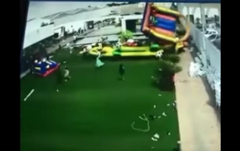 GUADALAJARA, JALISCO (01/JUN/2017).- Un grupo de niños se divertía en el jardín de un restaurante en la capital de San Luis Potosí, cuando una ráfaga de viento azotó el lugar y levantó del piso tres brincolines donde ellos se encontraban. Según un video difundido a través de redes sociales se aprecia el momento preciso en que ocurren los hechos en los que al menos cuatro menores resultaron lesionados.Según reportes oficiales, el inusual accidente ocurrido a las 16:02 horas del pasado 28 de mayo en una fiesta privada en la colonia Rural fue captado por las cámaras de seguridad del lugar. En la grabación se puede ver el momento en que el vendaval golpea los inflables y los niños caen, ante la mirada de terror de los otros asistentes.Entre los menores afectados se encuentra una niña de ocho años que, de acuerdo con reportes e imágenes del video habría salido junto a uno de los brincolines hasta la calle aledaña al inmueble y por la caída desde una altura considerable presenta traumatismo craneoencefálico. Sus padres iniciaron una colecta con la finalidad de reunir fondos para iniciar el tratamiento indicado.Los fuertes vientos seguirán en los próximos debido al mal tiempo en esa zona del país.