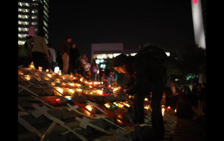 México | Movimiento por la Paz coloca ofrendas en el Ángel de la Independencia Recuerdan a muertos en lucha anticrimen Movimiento por la Paz coloca ofrendas en el Ángel de la Independencia Por: SUN 31 de octubre de 2011 - 21:22 hs El Movimiento por la Paz Justicia y Dignidad colocó cruces y velas en el Ángel de la Independencia. AP / CIUDAD DE MÉXICO (31/OCT/2011).- Al colocar una ofrenda de muertos en el Ángel de la Independencia, el poeta Javier Sicilia, quien encabeza el Movimiento por la Paz Justicia y Dignidad, dijo que esto es para recordar a las 50 mil personas fallecidas en esta guerra contra el crimen. "Es el reclamo de los muertos hacia el Estado y hacia los criminales", señaló a la vez que dijo que esta ofrenda busca hacer visible a los muertos, que tienen que estar acompañados de justicia y paz. En punto de las 18 horas, familiares de víctimas comenzaron a colocar alrededor del monumento del Ángel de la Independencia flores, veladoras y cruces con los nombres de los muertos para iniciar una procesión en silencio que durará 24 horas. Algunos integrantes de este Movimiento por la Paz también realizarán ayuno, entre ellos Julián Le Barón, miembro de la comunidad menonita quien sufrió la pérdida de su hermano. Temas Crimen Organizado Día de Muertos Javier Sicilia Recibe las últimas noticias en tu e-mail Todo lo que necesitas saber para comenzar tu día Registrarse implica aceptar los Términos y Condiciones