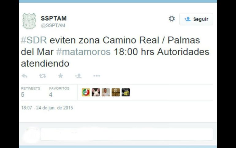 México | Autoridades piden a la población evitar el Camino Real-Palmas del Mar por seguridad Reportan situación de riesgo en Matamoros Autoridades piden a la población evitar el Camino Real-Palmas del Mar por motivos de seguridad Por: SUN 24 de junio de 2015 - 18:28 hs Las autoridades no abundan sobre los motivos para declarar la situación. TWITTER / @SSPTAM CIUDAD DE MÉXICO (24/JUN/2015).- La Secretaría de Seguridad Pública de Tamaulipas indicó que se registra una situación de riesgo en la zona de Camino Real-Palmas del Mar en la ciudad de Matamoros. A través de su cuenta de Twitter informaron que desde las 18:00 horas las autoridades se encuentran laborando en la zona. Solicitaron a la población evitar el tránsito en el lugar por motivos de seguridad. El pasado lunes 22, la dependencia informó de otra situación de riesgo registrada en la entidad, pero en la colonia Independencia en Reynosa. En ambos casos, las autoridades no abundaron sobre los motivos para declarar la "situación de riesgo". Temas Estados Tamaulipas Delincuencia Recibe las últimas noticias en tu e-mail Todo lo que necesitas saber para comenzar tu día Registrarse implica aceptar los Términos y Condiciones