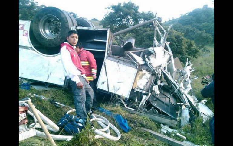 México | El percance movilizó a diversos cuerpos de rescate del estado de México y del DF Saldo de 14 muertos por accidente de autobús en Estado de México Los lesionados, en total más de 20, fueron trasladados en helicópteros para su atención médica Por: SUN 4 de octubre de 2013 - 09:35 hs Imagen que muestra parte del vehículo que volcó al caer a un barranco de 30 metros de profundidad. Foto: @alfaguilera ESPECIAL / NAUCALPAN, MÉXICO (04/OCT/2013).- El saldo es de 14 víctimas mortales, entre ellas dos menores de edad, por la volcadura de un autobús de la línea Huixquilucan-Toluca, el cual cayó a un barranco de unos 30 metros de profundidad en la carretera Naucalpan-Toluca. El percance ocurrió esta mañana en el kilómetro 14 de esa autopista, en el paraje Llano de las Flores, en San Francisco Chimalpan-Naucalpan. El vehículo se dirigía hacia el Metro Cuatro Caminos. El gobierno municipal de Naucalpan confirmó 14 personas muertas y más de 20 lesionadas, que fueron trasladadas a diversos hospitales para su atención médica. El percance movilizó a diversos cuerpos de rescate del estado de México y del Distrito Federal. Los lesionados fueron trasladados en helicópteros para su atención médica. Temas Estados Accidentes México Estado de México Lee También Frente frío 7: Estados que serán afectados con lluvias intensas Sheinbaum sobre las protestas del SAT: Son muy pocos trabajadores Todavía no se forma y "Sonia" ya afecta a México ¿Lluvia HOY, 15 de octubre, en CDMX? Este es el pronóstico del clima Recibe las últimas noticias en tu e-mail Todo lo que necesitas saber para comenzar tu día Registrarse implica aceptar los Términos y Condiciones