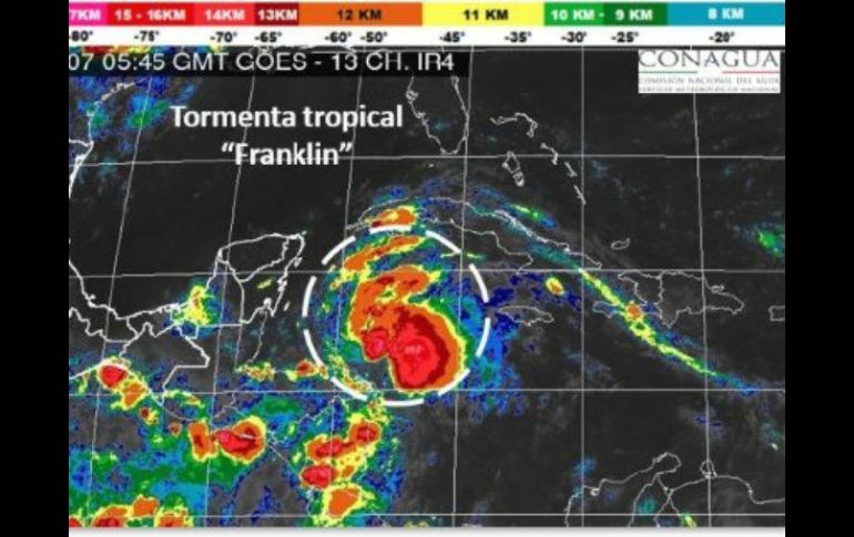 CIUDAD DE MÉXICO (07/AGO/2017).- El Servicio Meteorológico Nacional (SMN) reportó que se ha desarrollado la tormenta tropical 'Franklin' en el noroeste del Mar Caribe, al este-sureste de Chetumal, Quintana Roo.En el aviso más reciente emitido por el organismo dependiente de la Comisión Nacional del Agua (Conagua) informó que la tormenta tropical 'Franklin' se ubica a 610 kilómetros al este-sureste de Chetumal, Quintana Roo.Indicó que el fenómeno natural registra vientos sostenidos de 65 kilómetros por hora y rachas de 85 kilómetros por hora.El Meteorológico recomendó a la población extremar precauciones en general en las zonas de los estados mencionados por lluvias, viento y oleaje (incluyendo la navegación marítima) y atender las recomendaciones emitidas por las autoridades del Sistema Nacional de Protección Civil, en cada entidad.