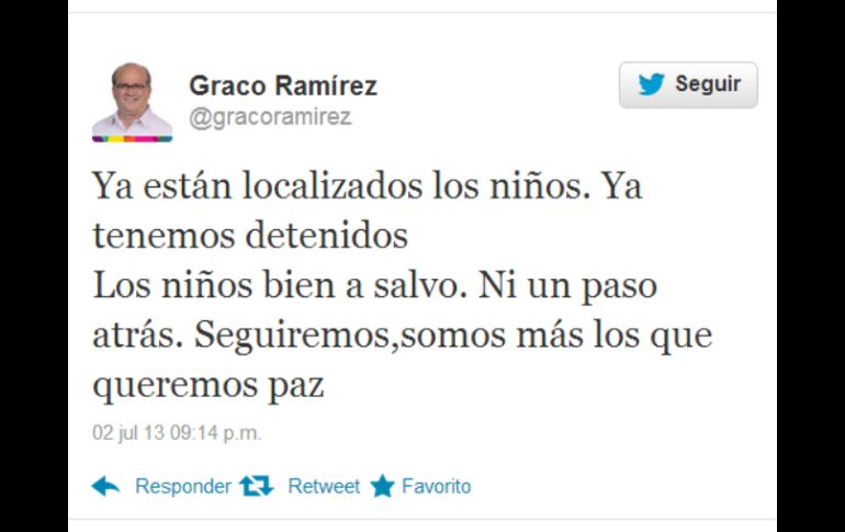 México | Al menos nueve niños fueron secuestrados de la estancia infantil ''La Abejita'' Secuestran a niños en Morelos, Graco afirma que fueron localizados Al menos nueve niños fueron secuestrados de la estancia infantil ''La Abejita'' Por: EL INFORMADOR 2 de julio de 2013 - 15:41 hs El gobernador Ramírez asegura a través de su cuenta en Twitter que los niños ya fueron localizados. TOMADA DE @gracoramirez / CUERNAVACA, MORELOS (02/JUL/2013).- Al menos nueve niños habrían sido secuestrados de la estancia infantil “La Abejita” ubicada en el poblado de Chamilpa de la Colonia Cuauhtémoc en Cuernavaca, Morelos. El hecho fue confirmado por el Gobernador de la entidad, Graco Ramírez, quien a través de su cuenta de Twitter afirmó que ya se actúa en coordinación “para salvaguardar la vida de los niños que fueron sustraídos del Kinder”. “Rechazamos esta provocación de la delincuencia, es un desafío más para que no se siga deteniendo delincuentes. Ni un paso atrás”, escribió en un segundo tuit el mandatario del Partido de la Revolución Democrática. Minutos después publicó un tuit más donde afirmó que los niños ya habían sido localizados e incluso señaló que ya había detenidos. "Ya están localizados los niños. Ya tenemos detenidos. Los niños bien a salvo. Ni un paso atrás. Seguiremos,somos más los que queremos paz", publicó el mandatario morelense. De acuerdo con versiones extraoficiales los menores habrían sido sustraídos por sujetos desconocidos que escaparon en al menos dos taxis. Apenas ayer lunes, luego de que el domingo miles de morelenses participaran en la marcha silenciosa para exigir a las autoridades de la entidad mayor seguridad, Graco Ramírez, quien es Gobernador por el Partido de la Revolución Democrática (PRD), aseguró que “está canijo” cambiar la situación del estado sin “una varita mágica”. Sicilia y activistas como activistas Julián LeBarón marcharon el domingo para exigir seguridad, paz y justicia; con él, cientos de morelenses se unieron en una marcha silenciosa por la ciudad de Cuernavaca, en Morelos. Los manifestantes de la Marcha Familiar en Silencio por la Paz acusaban el alza en los secuestros y los asesinatos en la entidad y la falta de resultados por parte de las autoridades. “Basta de secuestros, trabajen por la seguridad de todos y por su sueldo”, “Estamos hasta la madre”, “Estamos hartos de secuestros”, “Alto a la inseguridad”, “Morelos primer lugar en inseguridad ¿hasta cuándo?”, eran algunas de las pancartas de las familias, que vistieron de blanco. “Ojalá y pudiera tener una varita mágica, pues está canijo cambiar esto después de tantos años de no hacer nada y nada, eso es lo difícil, eso es lo duro, ¿usted cree que no estoy preocupado yo? Claro que soy el más preocupado porque eso no ocurra, me da vergüenza, me da pena como Gobernador que sigan ocurriendo estas cosas, hay que cambiarlas, hay que cambiarlas y estoy trabajando”, dijo este día Graco Ramírez en conferencia de prensa. El mandatario morelense reconoció tener vergüenza de que sigan ocurriendo delitos de alto impacto en el estado, y aseguró que está haciendo todo su esfuerzo para que la situación cambie en Morelos. “Estoy trabajando para eso, no soy negligente, estoy trabajando para eso, todos los días, para que esos casos no vuelvan a ocurrir, pero son cada vez la excepción, no la regla”, dijo el Gobernador perredista. Sinembargo.mx Temas Estados Graco Morelos Secuestros en México Lee También Clima en Tepatitlán de Morelos hoy: el pronóstico para el viernes 10 de octubre de 2025 Clima en Ciudad de México hoy: el pronóstico para el viernes 10 de octubre de 2025 Metro CDMX: Fecha en que abrirán todas las estaciones de la Línea 1 Esta es la verdadera identidad del "Juan Gabriel" captado en París Recibe las últimas noticias en tu e-mail Todo lo que necesitas saber para comenzar tu día Registrarse implica aceptar los Términos y Condiciones