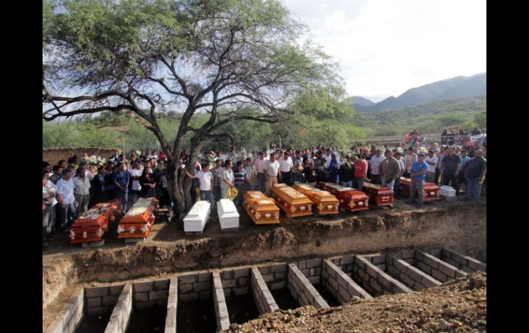México | Familiares y amigos despiden a los 11 integrantes de la familia asesinada en Coxcatlán Sepultan a víctimas de multihomicidio en Puebla Familiares y amigos despiden a los 11 integrantes de la familia asesinada en Coxcatlán Por: SUN 13 de junio de 2016 - 13:47 hs COXCATLÁN, PUEBLA (13/JUN/2016).- Cientos de personas despidieron a los 11 integrantes de una familia que el viernes pasado fueron asesinados en el municipio poblano de Coxcatlán. Los féretros de los cinco hombres, cuatro mujeres y de los dos niños asesinados en la comunidad El Mirador dieron su último paseo por las calles de esa región asentada en la Sierra Norte de Puebla, donde un comando ingresó a dos humildes viviendas y mató a los integrantes de una familia. El sacerdote Anastasio Hidalgo, de la parroquia de San Juan Apóstol, ofició la misa donde familiares y amigos de las víctimas despidieron a los suyos entre lágrimas y abrazos. En féretros color café yacían los restos de la señora Plácida Sánchez Martínez de 59 años y de Ángela de 30 años, Ángel de 23 y Jony; mientras que en los pequeños ataúdes en color blanco sus nietas Monserrat de 10 y Carolina de nueve años. También los restos de Baltazar Sánchez Montalvo de 42 años y su esposa Isabel Hernández Sánchez, de 43; así como de sus hijas, Silvia y Belén y el esposo de esta última, vieron a cientos despedirse. El alcalde del lugar, Vicente López de la Vega, informó que fueron enviados elementos de la Policía Municipal a resguardar la comunidad, pero reconoció que los agentes son insuficientes para cuidar a los habitantes de cuatro juntas auxiliares y 17 comunidades. En entrevistas para medios locales, reveló que se solicitó al Ejército Mexicano la presencia en el lugar de la matanza para resguardar al resto de la familia que vive con temor de otro ataque armado. La Fiscalía General del Estado insiste que la principal línea de investigación es un pleito personal encabezado por un sujeto que hace años violó a una de las víctimas y juró vengarse si lo denunciaban. Temas Puebla Estados Homicidio Recibe las últimas noticias en tu e-mail Todo lo que necesitas saber para comenzar tu día Registrarse implica aceptar los Términos y Condiciones