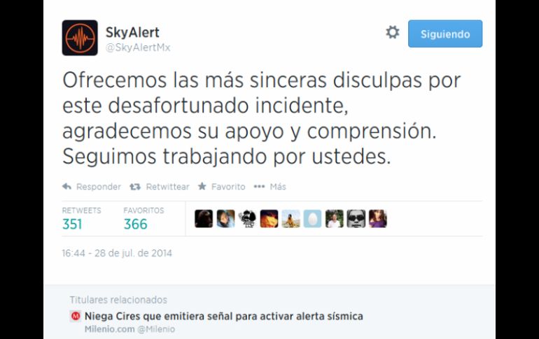 México | La aplicación explica que su plataforma malinterpretó un mensaje enviado por el CIRES SkyAlert se disculpa por falsa alerta sísmica en el DF La aplicación explica que su plataforma malinterpretó un mensaje enviado por el CIRES Por: SUN 28 de julio de 2014 - 16:57 hs SkyAlert, ofreció disculpas en su cuenta de Twitter. ESPECIAL / CIUDAD DE MÉXICO (28/JUL/2014).- SkyAlert, la aplicación de alerta sísmica, movilizó a miles de sus usuarios cuando generó una alerta de sismo a las 12:16 horas de este lunes. Sin embargo, se trató de una falsa alarma. La aplicación lanzó un mensaje en su cuenta de Twitter y en dispositivos móviles. "Alerta sísmica. Prepárese para un sismo en los próximos segundos. #SkyAlert Activo. 28 jul 14 12:16:40". A través de su cuenta de Twitter la aplicación explicó que su plataforma malinterpretó un mensaje enviado por el Centro de Instrumentación y registro Sísmico (CIRES) derivando en la falsa alarma. "Al decodificar el mensaje detectamos que parte de su estructura coincidió con nuestro formato de alertamiento sísmico. Esta situación derivó en la emisión automática del sistema de alertamiento de #SkyAlert a las 12:16hrs". La aplicación indicó que se tomaron las medidas pertinentes para seguir mejorando el sistema en todos sus dispositivos y plataformas. Al mismo tiempo ofreció una disculpa por este desafortunado incidente. Temas Sismos Estados Ciudad de México Aplicaciones Recibe las últimas noticias en tu e-mail Todo lo que necesitas saber para comenzar tu día Registrarse implica aceptar los Términos y Condiciones