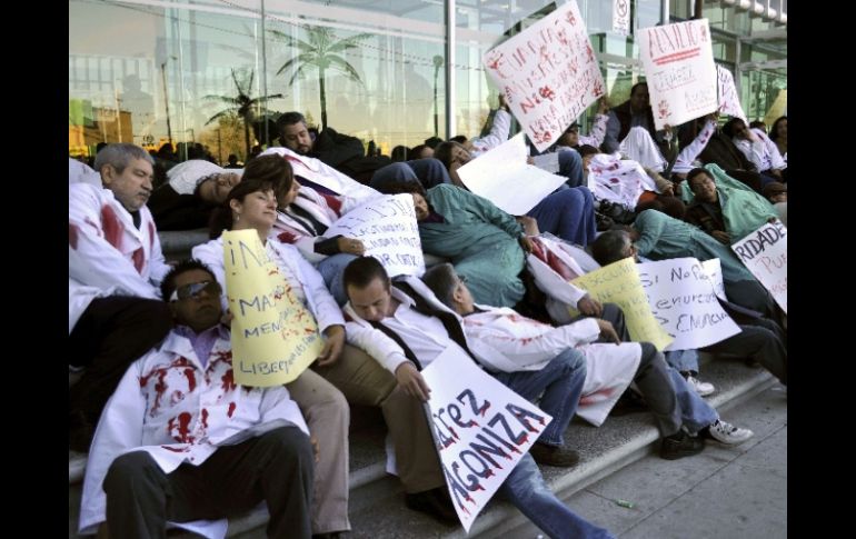 México | Dejaron batas manchadas de sangre en la la Fiscalía de la Zona Norte Termina paro de médicos en Ciudad Juárez Adelantan que podrían continuar con movilizaciones hasta que cesen amenazas de criminales Por: NTX 14 de diciembre de 2010 - 11:53 hs El grupo de profesionales de la salud protestan por el secuestro y la extorsión que padecen. AP / CIUDAD JUÁREZ, CHIHUAHUA (14/DIC/2010).- Médicos en protesta por la extorsión y el secuestro del que son víctimas, concluyeron su protesta de 24 horas contra las autoridades colgando batas blancas manchadas de sangre en las oficinas de la Fiscalía en la Zona Norte. Los manifestantes argumentaron que es la manera más clara de expresar lo que a diario viven, pues siempre tienen el temor de ser víctimas de un atentado en Ciudad Juárez. "Es el fiel reflejo de lo que vivimos, nos manchamos de sangre, pero no de los pacientes, sino de nuestros propios compañeros al ser presas de la delincuencia", indicó Arturo Robledo, miembro del Comité Médico Ciudadano. Además, colocaron pancartas en las que se expresaba: "Juárez agoniza", "Ni una muerte más", "Juárez vive", "Renuncien si no pueden", en un tendero que improvisaron los inconformes en la entrada principal de las oficinas estatales. Por su parte, el doctor Alejandro Ignacio Terrazas Gracia aseguró que fueron al menos 800 médicos de un total de mil 200 que operan en la frontera los que participaron durante el paro laboral que duró 24 horas desde el lunes. Los médicos despachan en seis clínicas del Instituto Mexicano del Seguro Social (IMSS), cuatro clínicas particulares y en al menos 500 consultorios privados ubicados en toda la mancha urbana. Anunciaron que de no atenderse sus demandas, las protestas seguirán hasta que el hostigamiento de los delincuentes cese contra ellos. Temas Estados Chihuahua Ciudad Juárez Lee También Esta es la ubicación de las presas que abastecen al Sistema Cutzamala Reportan dos muertos por lluvias en México Trump amenaza con "incremento masivo" de aranceles a China La actualidad de Diego Ochoa, formado en Chivas y destacado en el Mundial Sub-20 Recibe las últimas noticias en tu e-mail Todo lo que necesitas saber para comenzar tu día Registrarse implica aceptar los Términos y Condiciones