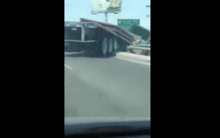 CIUDAD DE MÉXICO (29/JUN/2017).- La tarde de este jueves se registró un incidente en el que el conductor de un tráiler aparentemente perdió el control de su unidad y cayó desde un paso a desnivel de la avenida Manuel L. Barragán, en San Nicolás, Nuevo León.El incidente fue captado por un automovilista y ocurrió cuando el chofer del vehículo que transportaba placas de acero, con razón social Autolíneas Express González, presuntamente intentó rebasar a otro tráiler, lo que provocó que perdiera el control, se estrellara contra el muro de contención y cayera.El percance ocurrió a la altura de la calle Juan Pablo II. Al lugar arribaron elementos de la Cruz Roja y de Protección Civil del estado. No se reportaron lesionados por el evento.